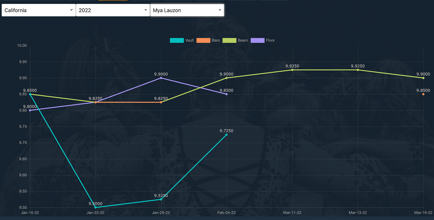 Mya Lauzon was the other freshman to crack the Cal lineup before missing some time due to either illness and/or injury. With the Bears shorthanded for the Pac-12 Championships, Lauzon came up huge on beam but also bars. I expect to see Lauzon on beam, but cede the bars spot back to Schank.