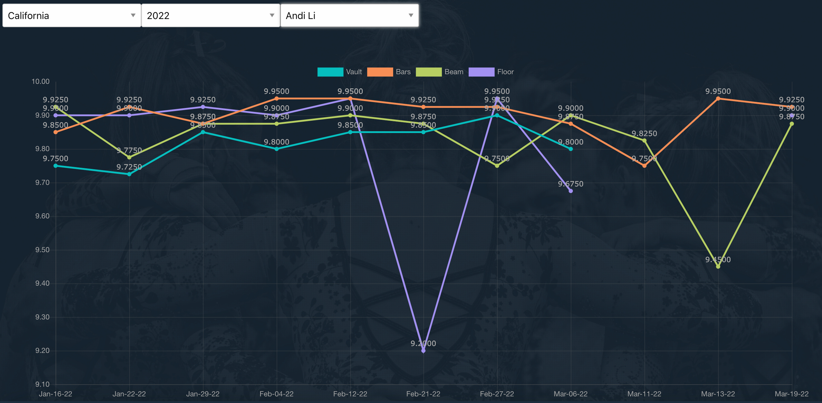 In 2022, Andi Li has been Cal’s most consistent scorer of 9.90 and above.