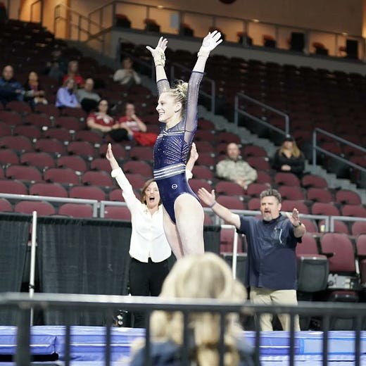 Sophomores Maddie Williams and Mya Lauzon as well as junior Gabby Perea each competed in three events. Fellow sophomore Ella Cesario made her debut (I believe) by competing in vault and bars. While eMjae Frasier was the lone freshman to debut on Saturday, fellow classmates Miki Aderinto and Casey Brown are capable of doing the all-around with Jayden Silvers, who graduated high school early to join the squad this semester, a potential factor in the floor rotation.