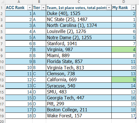 Conference voting showed a clear tiering within the conference. All of the teams in Tier A are ranked in the top 20 of the AP Preseason Poll. After finishing last year in 7th place, Cal is forecasted to drop back to 12th place in the upcoming season.
