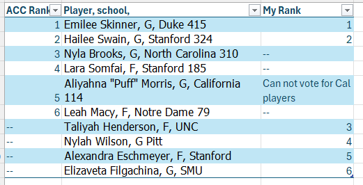 For conference champion, I chose NC State over Duke on my ballot. The Wolfpack landed all-world transfer Khamil Pierre from Vanderbilt (20 points/game, 10 rebounds/game). Pierre was selected to the All-conference team, alongside teammate Zoe Brooks (14 ppg, 4 assists). The all-conference duo rounds out a deeper roster than Duke can offer, though Duke counters with top-ranked freshman Emilee Skinner making an immediate impact.