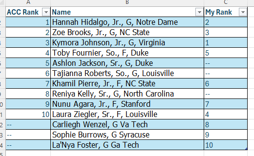 My ballot included Virginia breaking into the top group of teams, having them finish 4th overall, up from the consensus spot of 7th. The Cavaliers return All-ACC Junior Guard and All-American Honorable Mention Kymora Johnson and fellow upperclassmen Paris Clark and Olivia McGhee. They have the most returning starters and are not relying an a huge influx of scoring coming from freshman or transfer players.
