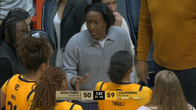 In the fourth period, Cal made a concerted effort to get the ball to the low post. Wake Forest stuck to zone defense primarily; Cal found the soft spot in the high post then fed the ball to the low post for the short shot attempt. Sakima Walker and Naya Ujukwu combined for nine points over the first five minutes of the period, as Cal led 53-45 with just under five minutes left in the game.