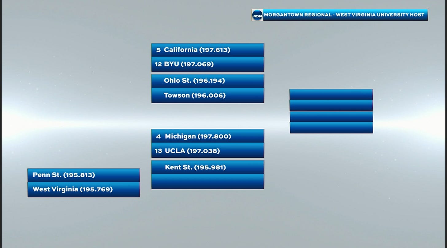 The Cal Bears will aim to be one of two teams to make it out of the Morgantown, West Virginia Regional to make the NCAA βElite Eightβ. The 36-team NCAA Womenβs Gymnastics field was announced on Monday afternoon with the four regionals being Athens, Georgia (with top-overall seed Florida), Salt Lake City (with host Utah as the 6th seed and LSU as the 3rd seed), and Tuscaloosa, Alabama (with second-overall seed Oklahoma).