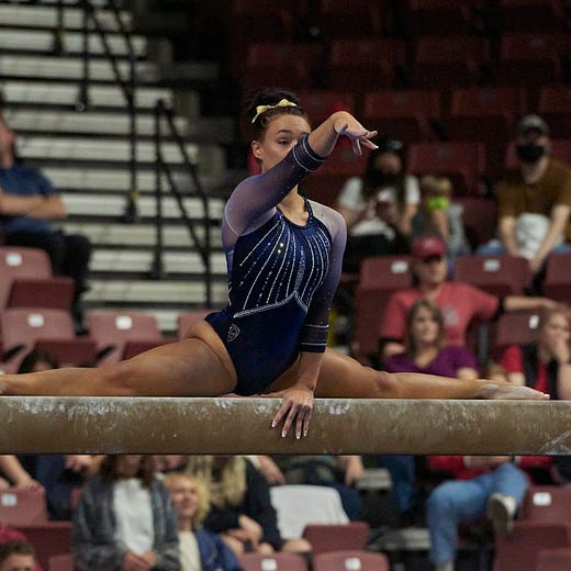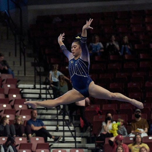 It would be interesting to see the Cal lineups for the NCAA Regional. In addition to Andi Li back to doing the all-around and Nina Schank back for 2-3 events, 5th-year senior Kyana George might be available for either the beam or the floor after doing exhibitions of both after coming back from an offseason Achilles injury.