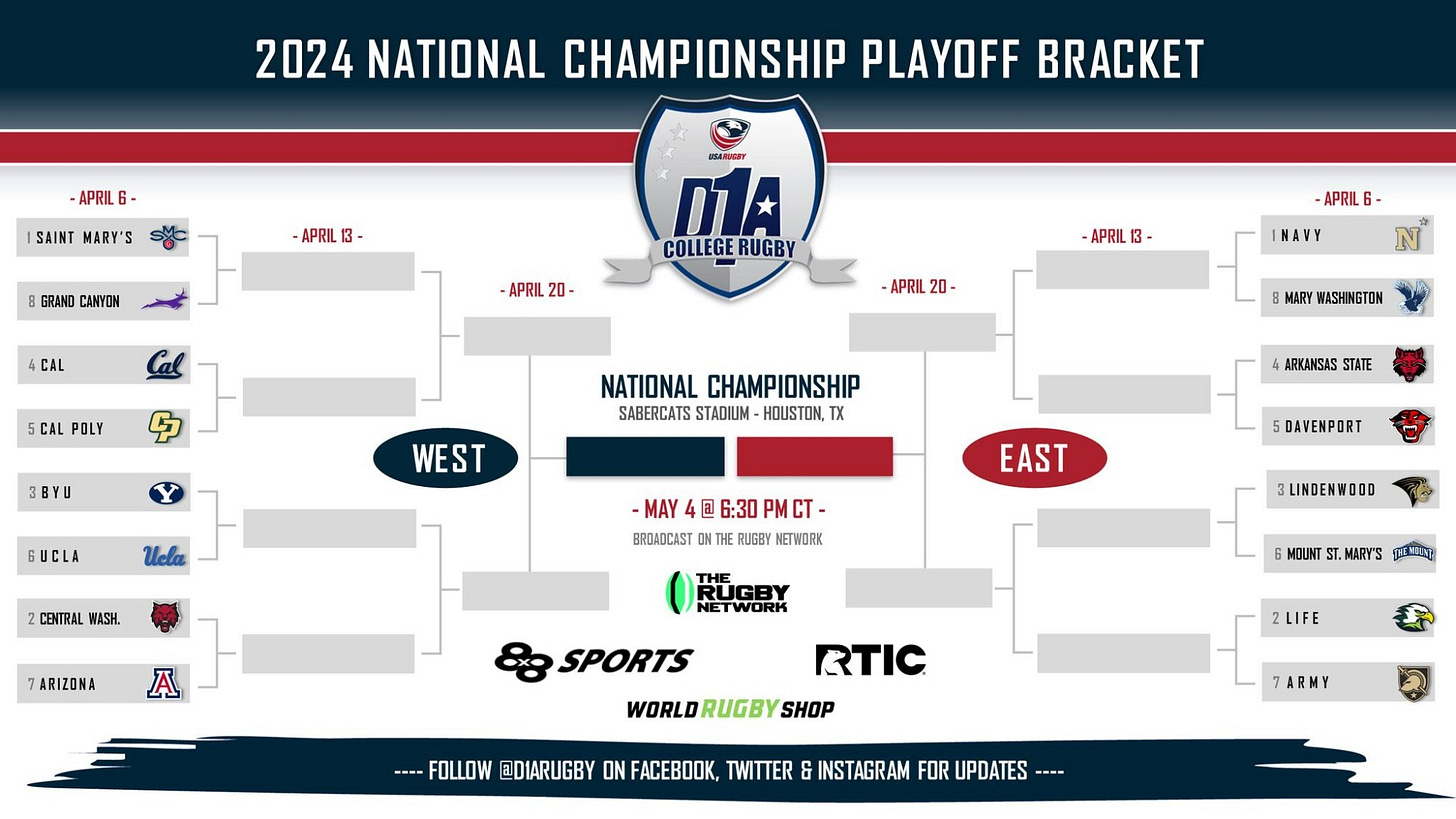 Cal Rugby (10-3) is arguably one of about seven teams that can realistically win the 2024 D1A National Championship. Golden Bears earned the 4th seed in the West and a first-round home match against Cal Poly this Saturday from Witter Rugby Field.