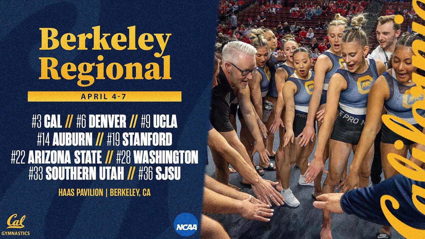 No.3 Cal Women’s Gymnastics is the host to the announced way-in-advance NCAA Berkeley Regional. The Berkeley Regional will start with a play-in dual meet today (Thursday) at 2 PM PT between San Jose State and Southern Utah. The winner will advance to Friday’s session 2.