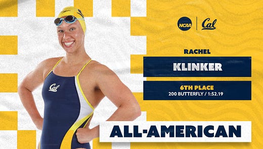 On a weekend where the NCAA record book was often rewritten, Cal junior Rachel Klinker’s personal best was good for 6th place in 200y Fly.