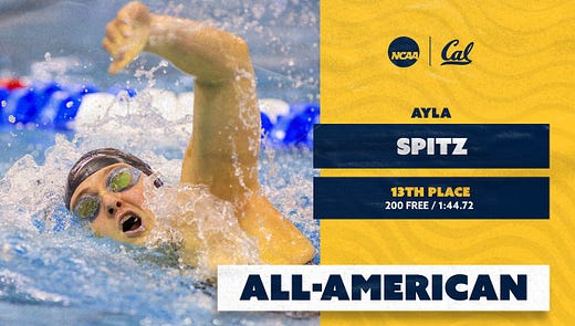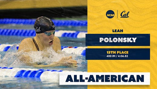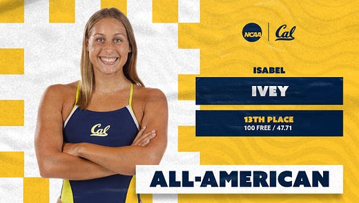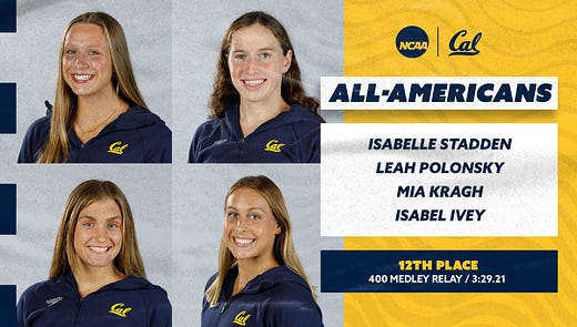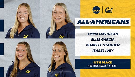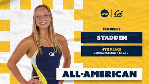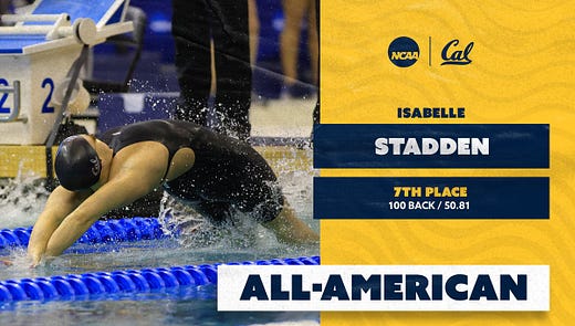 Behind only Ivey, Isabelle Stadden was the second-best Cal Bear at the NCAA this year. Beyond the two A-Finals in the backstroke event, Stadden also raced in three relays - the backstroke for the two relays but also 100y Free for the 400y Free relay.