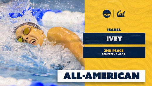 One extra incentive for Ivey to return is that Cal just added Canadian Olympian and NCAA Record Holder Maggie Mac Neil as a graduate transfer. Mac Neil has a bit of a down year in 2022, but she set the NCAA record in 100y Fly in 2021. Mac Neil has also been an NCAA champion in 100y Free.