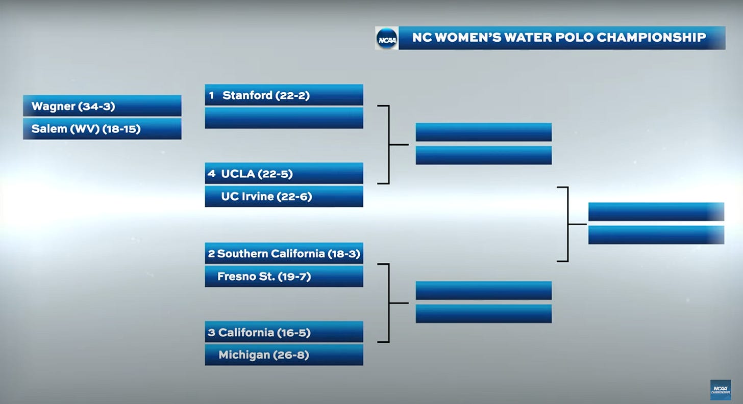 Needing at least another major win over a Stanford, USC, or UCLA in their final three matches, Cal Womenβs Water Polo came through on their last chance and earned a spot in the 2022 NCAA Championships. The Golden Bears are seeking to become only the 4th team to win this championship (yep, the other threes are Pac-12 foes Stanford, USC, and UCLA).