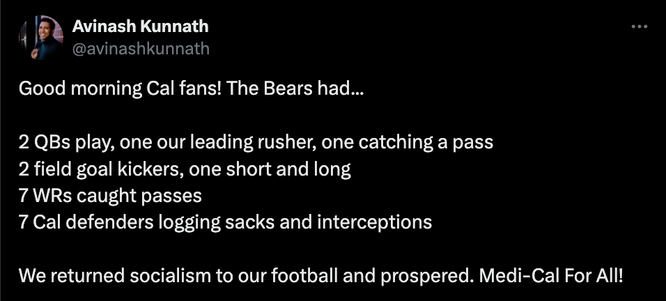 Enjoy the Cal receiving corps, which is finally getting a chance to show us what we were all excited about this offseason. With Tobias Merriweather and Kyion Grayes back, even in a limited capacity, the spacing on the field finally opened up enough for the Bears to feel confident to sling it 55 times. Nyziah Hunter, Mikey Matthews, Jonathan Brady, Jack Endries, Trond Grizzell, even Jordan King are getting looks and touches. This unit could make some noise to finish November.