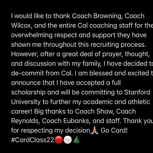 But just minutes before the final whistle, DL commit Jaxson Moi announced that he was decommitting from Cal, instead choosing the despicable Stanfurd Cardinal.