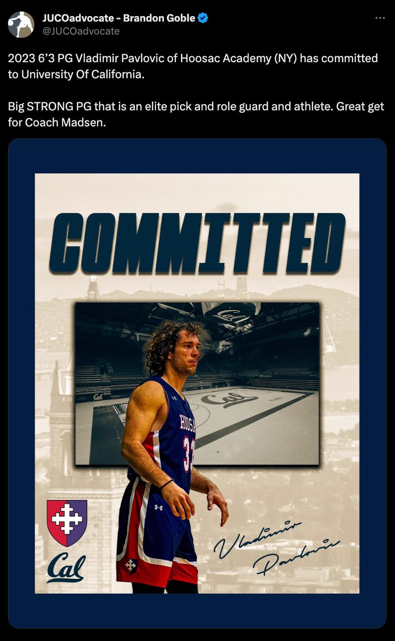 Mark Madsen has found the last addition needed for the 2023 recruiting class. Vladimir Pavlovic will round out the Cal roster as the Hoosac Academy point guard made his commitment earlier this weekend. The Bears now enjoy significant depth at the point guard spot.