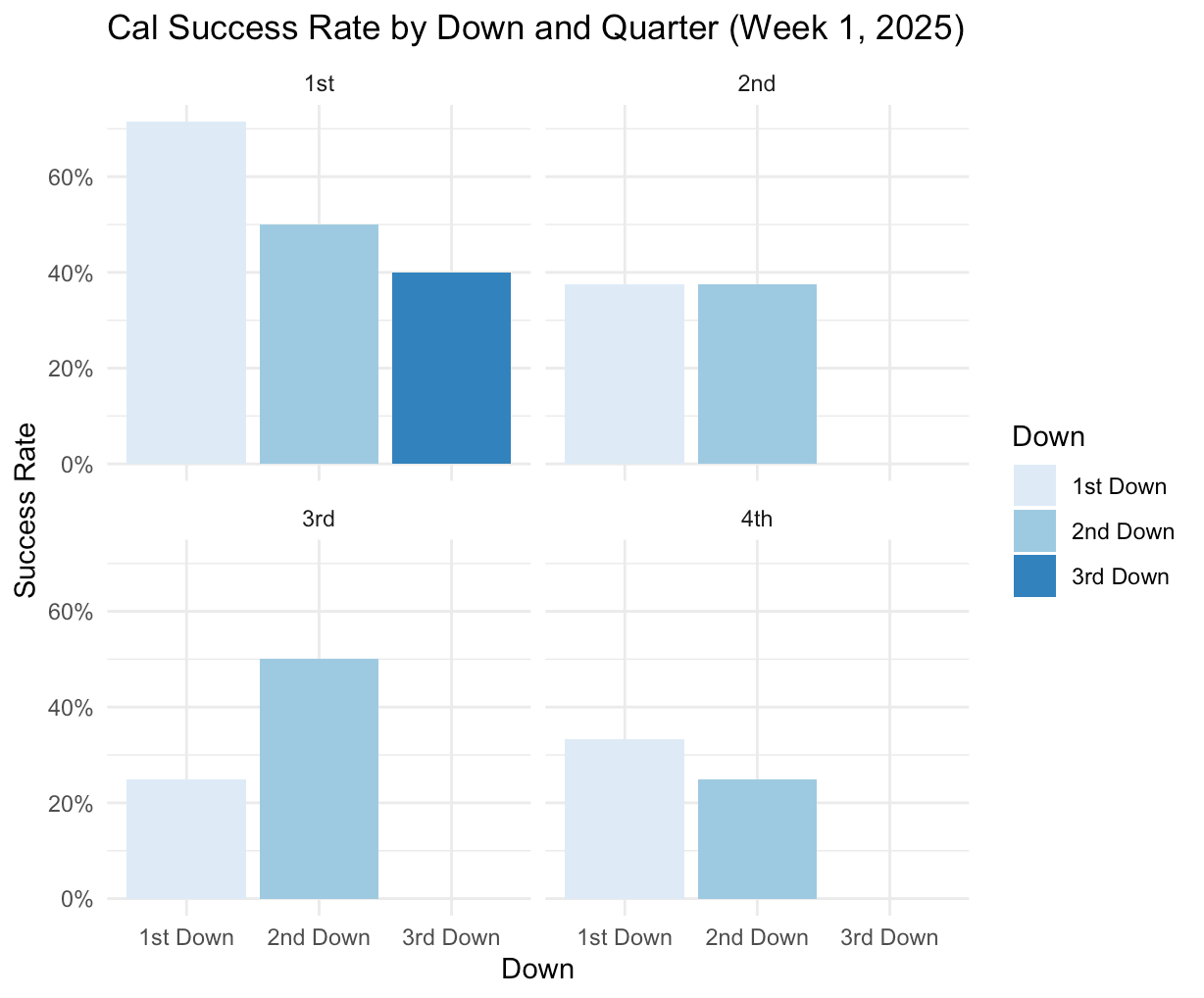 First down (~45% overall): Nearly half of Cal’s first-down plays were successful, helping the offense to advance in manageable situations.
