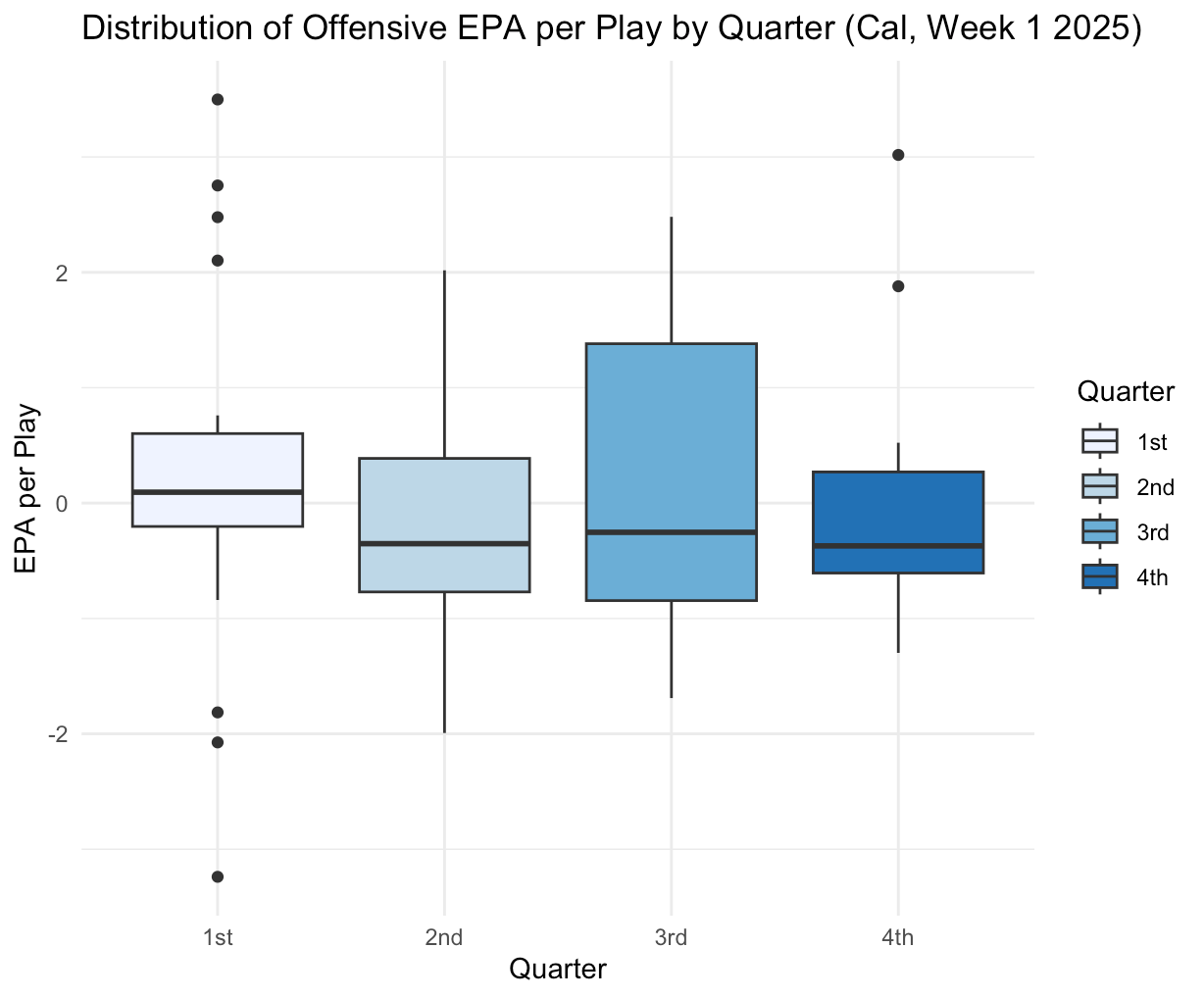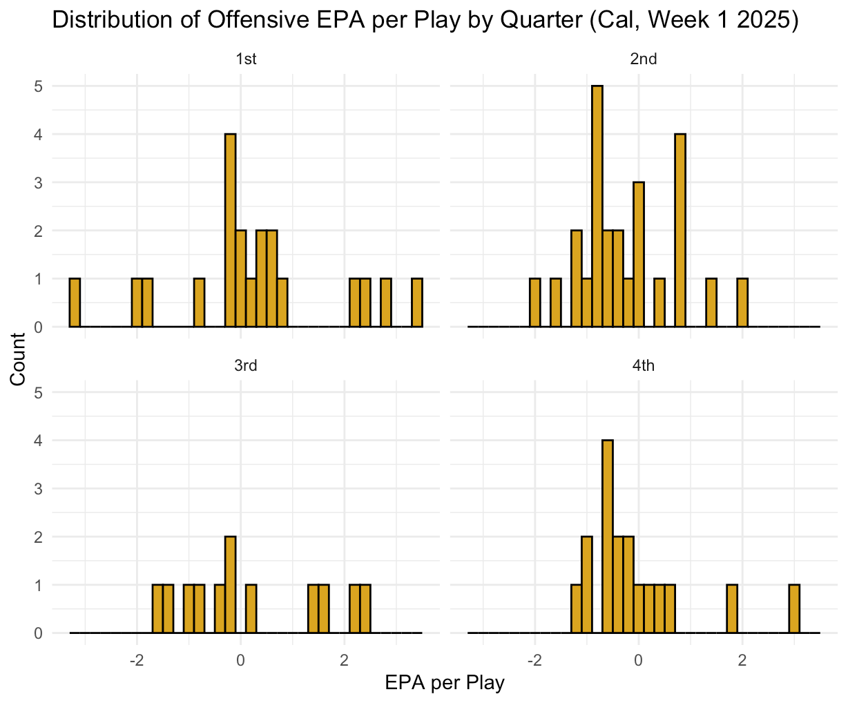 The histograms show how Cal’s plays stacked up in terms of expected points added (EPA) by quarter. Most of the plays cluster around a slightly positive EPA—a mark of consistent ball movement in small, efficient increments rather than relying on a few explosive gains.