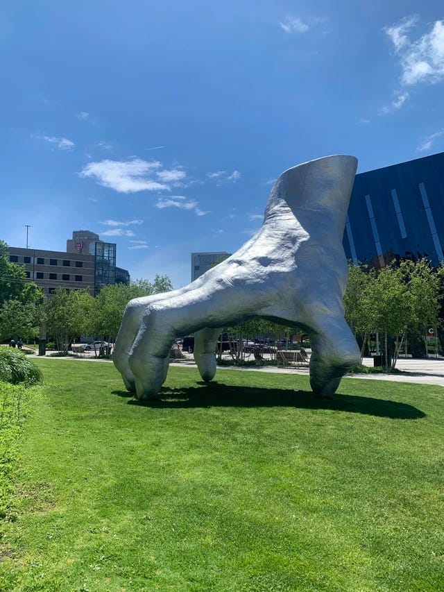 [Cleveland, OH]: “Judy’s Hand Pavilion is a writ large representation of the hand of the artist’s [Tony Tasset] wife, who is a celebrated contemporary abstract painter. Indulging in the pleasures of verisimilitude, scale, and a lustrous finish, the work critically examines the artistic traditions of appropriation, pathos, and pleasure. Brightly colored, richly narrative, playful yet satirical, the artist is best known for his large-scale sculptures that draw from the visual language of American roadside advertising.”