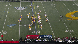 The above play is Marcel Dancy in the 2022 24-14 win over USC. To me, it looks like a weirdly designed play. Straight ahead blocking except for H-back who pulls right to protect Chase, who rolls to the right. Garbers is in the Pistol and immediately hands it off to Dancy. All the action is to the right and Garber's head is turned so he didn't even read USC's left side of the line post-snap. The OLB quickly sees the run and is unblocked, so should have a TFL 3 yards deep but Dancy x-for-spin-move his way for a big gain. Look at the WR in motion. He's wide open. You wouldn't waste a receiver being that wide open. Look again at the WR at the beginning of the play. USC is playing in Cover -1 with the safety cheated over to his left. As the WR goes in motion, the DB drops back to and yells at the one-high safety to reposition to be more center coverage. Notice that nobody follows the WR, which means USC is in zone. As the second man from the outside, the OLB has responsibility for the WR in motion. Notice where the WR is when the ball is snapped, which is next to the H-back roughly behind the tackle and guard. Notice where the WR ends up - unguarded. The hand off is so quick that the OLB quickly sees that its a run; the WR is a wasted man. Only a fool would run an naked counter right into an unblocked OLB like that on 3rd and 1. While Musgrave has his faults, I don't think he's that stupid. I think Chase Garbers called for the snap too early and the WR couldn't do his job of pulling the OLB away. Dancy's spin move converted a 3rd and short and the Bears won because of it.