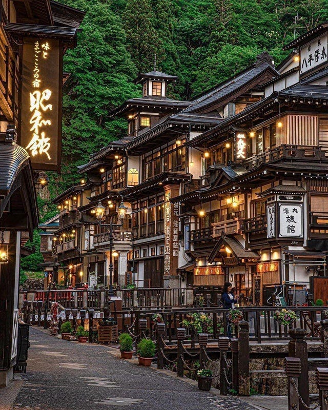 This picture is from Ginzan Onsen in Obanazawa in Yamagata, north of Tokyo. The town is home to wooden hot spring inns lining each side of the Ginzan River. The view reminds visitors of scenes from the famous film “Spirited Away” by Hayao Miyazaki. Before that the town was used as a location of NHK’s popular TV drama series “Oshin”, a monumental hit of 1983.