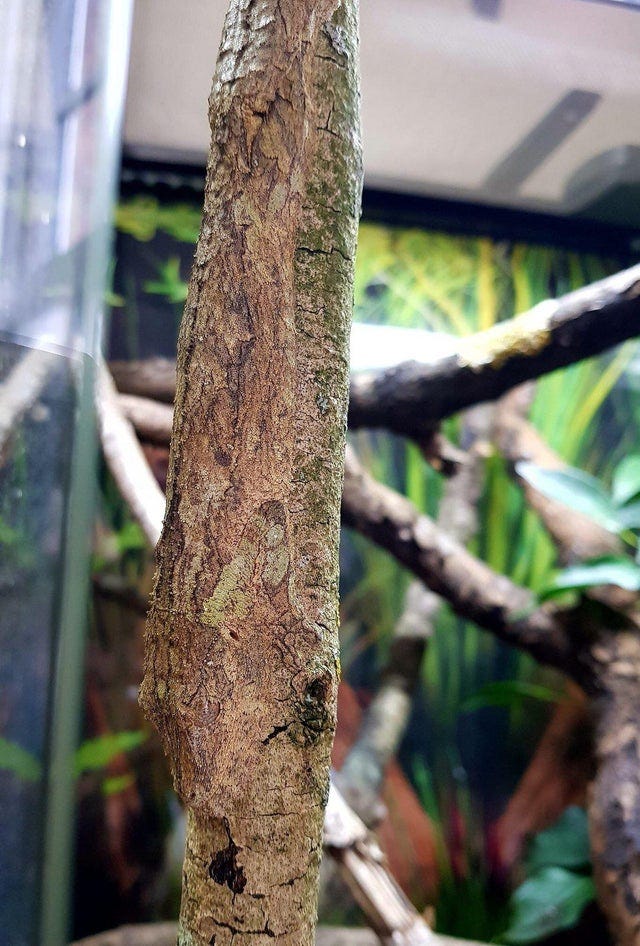 about a 1/4 of the way up on the left hand side of the trunk, you can see a circle that is a different shade. That's the left eye. The head is pointing down