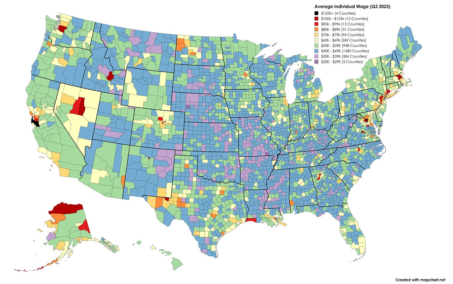 It would be interesting to know the source of the data. I get that anyone can create a map like this through the website shown on the map. What isn't apparent is the data source or the data. One imagines the Bureau of Labor as a possible source, or the IRS, or...?