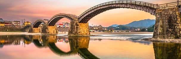 The Kintaikyo Bridge was built in 1673. The bridge collapsed in 1950 due to a typhoon but was faithfully reproduced in 1953. It is the most identifiable symbol of Iwakuni city in Yamaguchi prefecture.