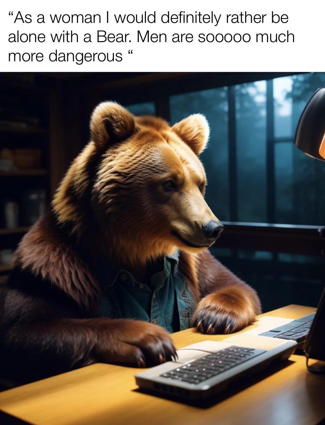 Women are not joking when they say they would rather be in the woods with a bear than a man they don't know. I 100% would choose the bear. I think men don't really understand just how dangerous men are to women. There was a survey several years ago in which women were asked, what is the first thing you'd do if there were no men in the world and the overwhelmingly most popular answer was "walk by myself after dark." Seems simple but women can't safely do it, and only because of men.