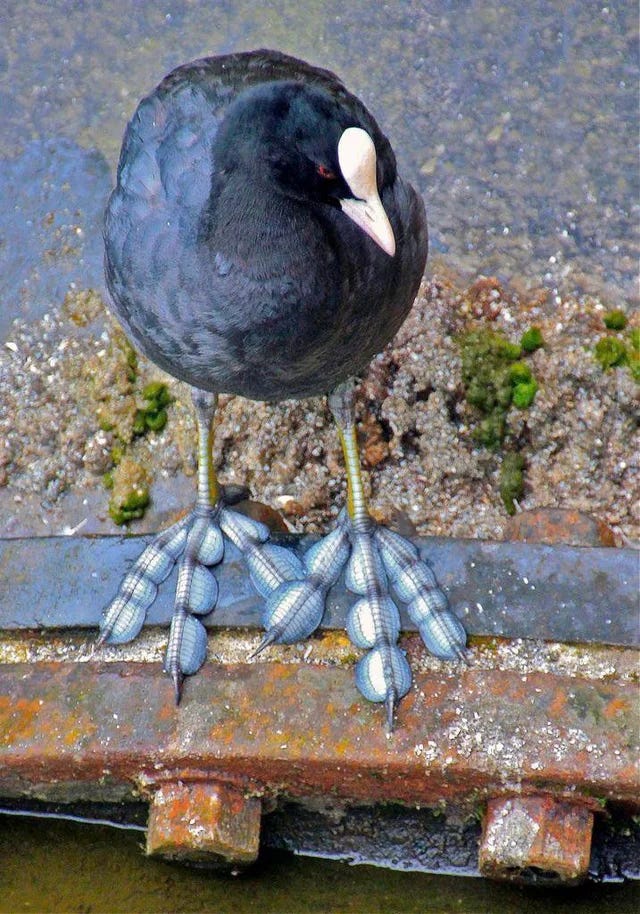 The Ralliedae family is commonly lumped in with ducks (Anatidae) because they superficially look like them and are not that far removed from them in terms of evolution. The Ralliedae family includes crakes, coots, rails, and gallinules. They are usually water-loving birds. Here we see a coot, which has lobate toes. Grebes also have lobate toes.