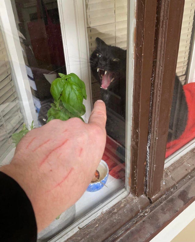 That cat bears a resemblance to my Cricket, although he has never scratched me that badly. He does bite my toes after I come out of the shower though, which is weird.