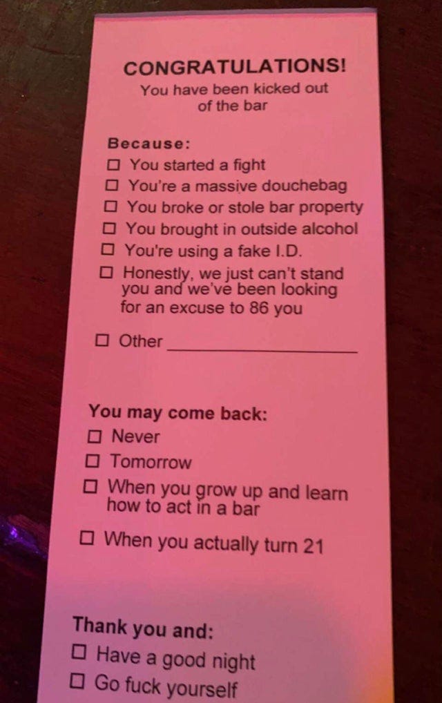 I was kicked out of a bar for bringing in a MosBurger in my pocket - so I deserved it. Their rules and I was being cheeky.