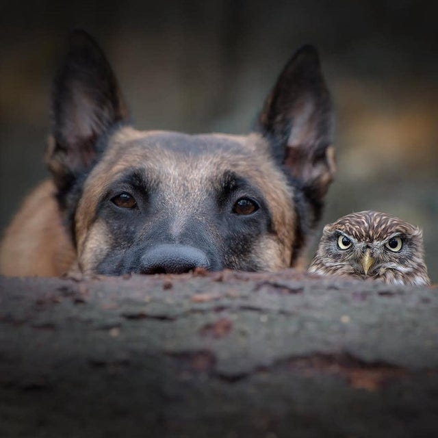 They are the pets of photographer Tanja Brandt. The dog is "Dio" and the owl is "Shröder"