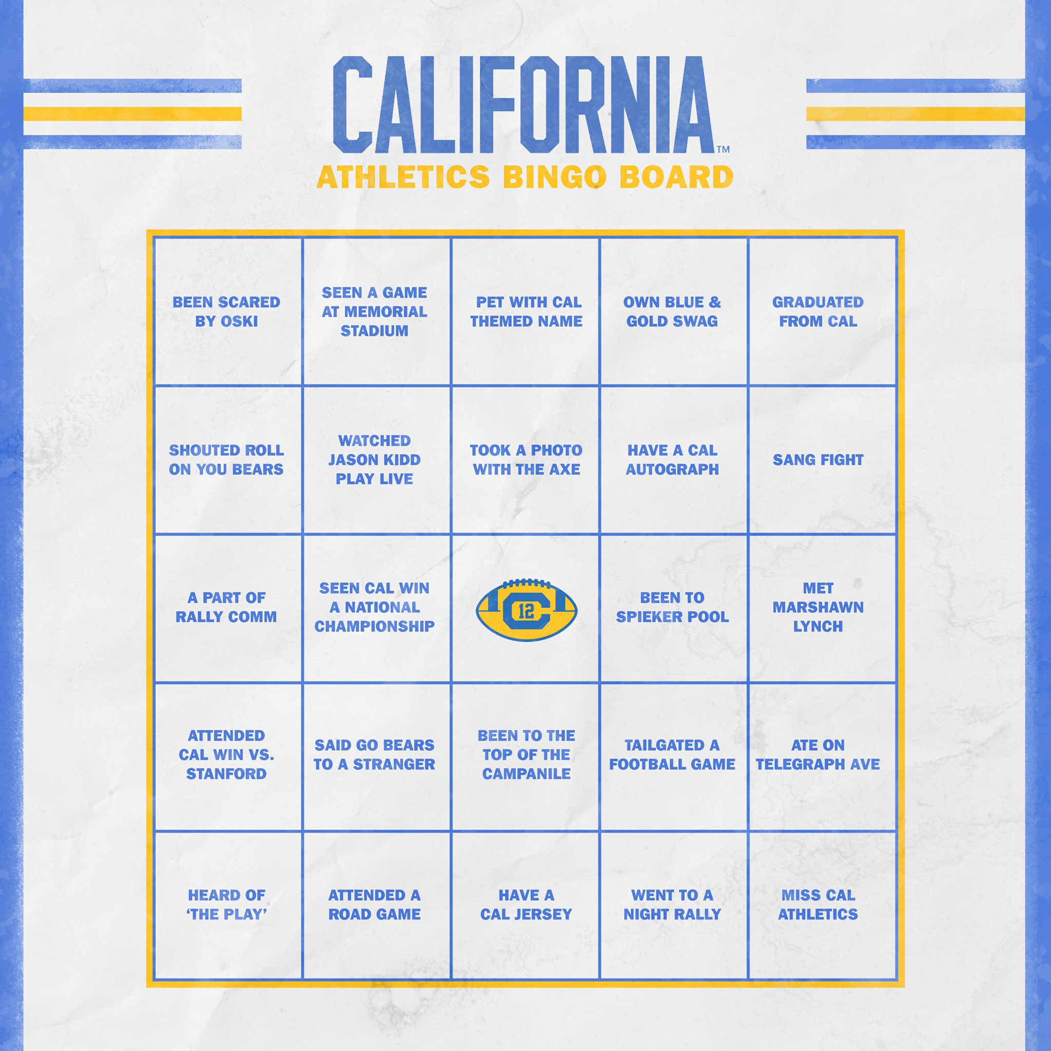 I feel like I'm missing some easy ones: scared by Oski, Cal-themed pet, photo with the Axe, Spieker Pool. The other three are tougher to achieve: seeing Jason Kidd, meeting Marshawn, being in Rally Comm.
