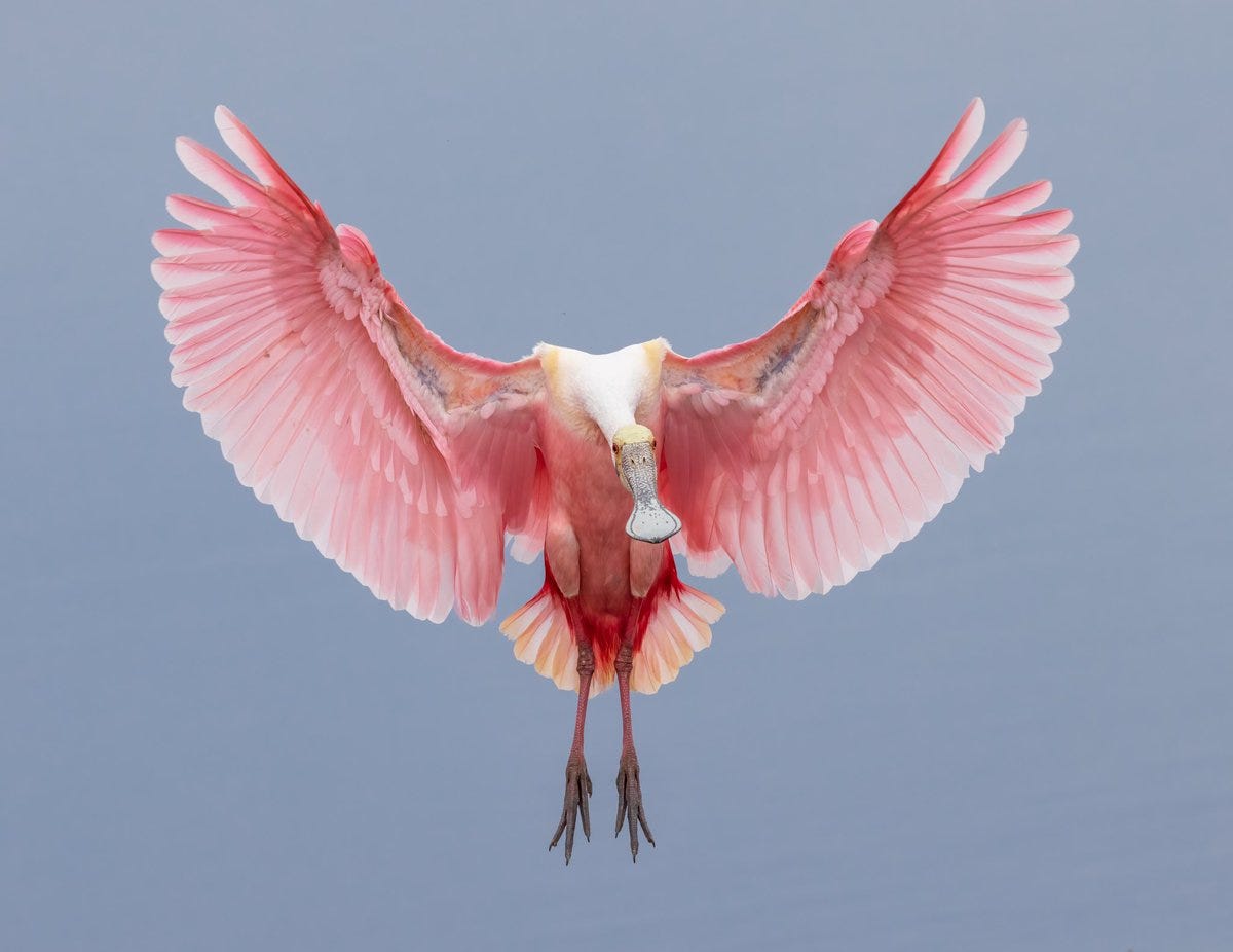 Flamingos and roseate spoonbills – two pink, long-legged wading birds with similar-looking heads, wing shapes and plumage – are not related. Flamingos belong to the Metaves, while spoonbills belong to the Coronaves.