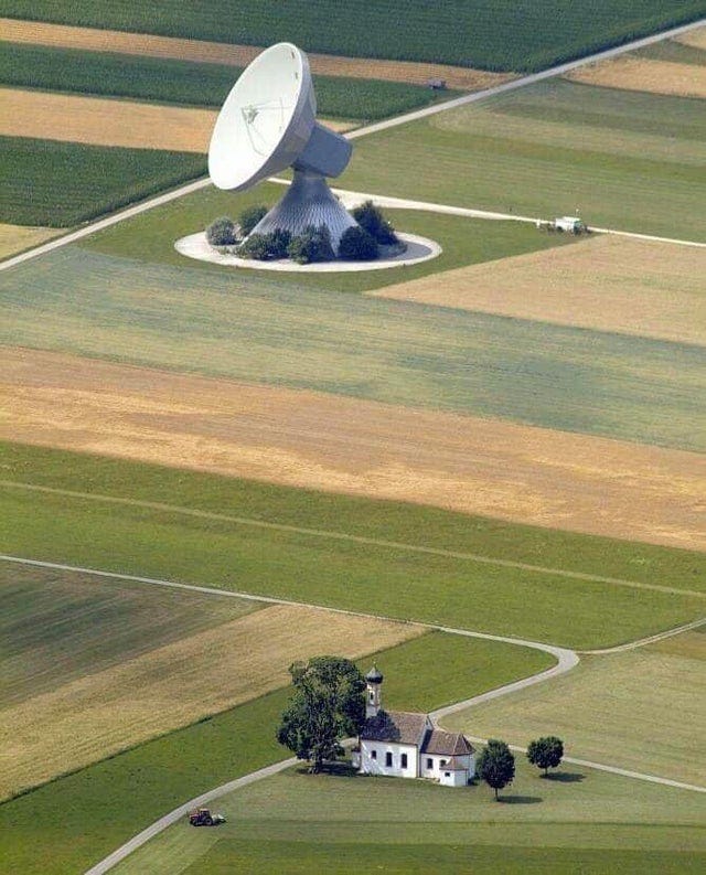 It is the St. Johannes d. Täufer church in rural Raisting, Germany. It just happens to be located next a C-band sat downlink dish "farm".