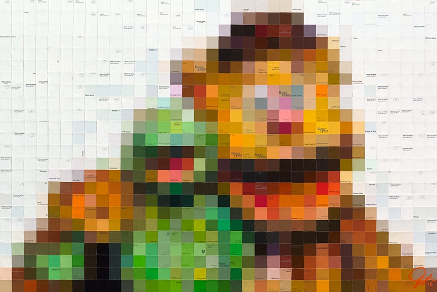 It's Fozzy and Kermit, done with paint sample squares. Frogs + Bears this weekend.