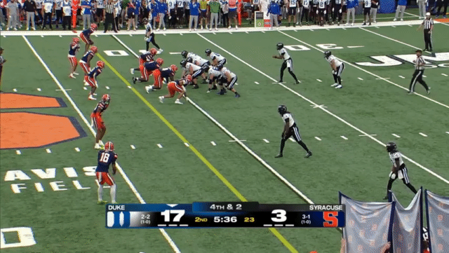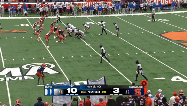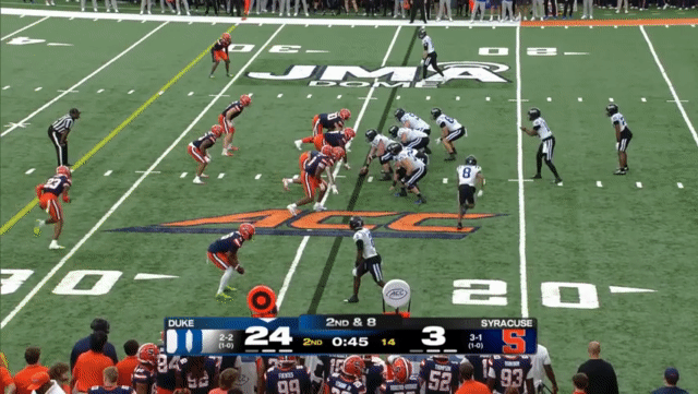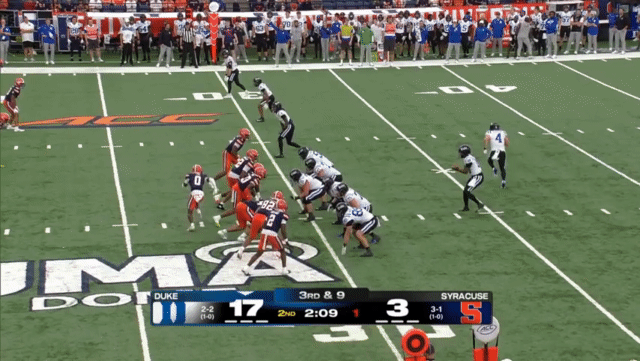 Mensah will have a number of throws like this, rolling out, and throwing without setting his feet, even throwing across his body far more than he should (and I don’t think he has enough arm strength to get away with doing so consistently). Duke had a few plays like the following, where it’s not even clear to the receivers who the intended target is, which probably speaks to the plays they drew up—receivers shouldn’t be crowded together in the same space:
