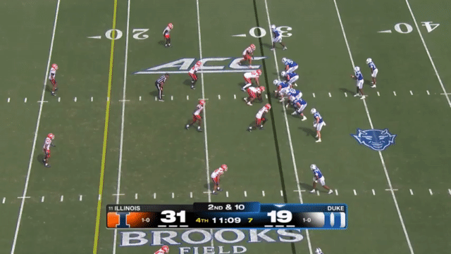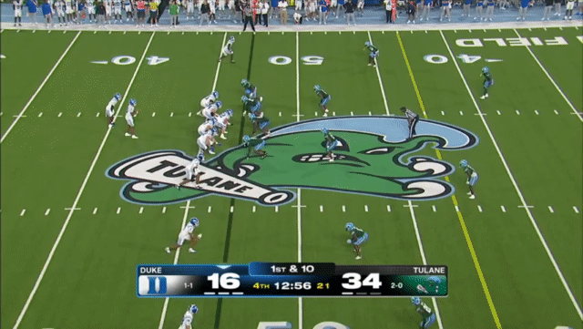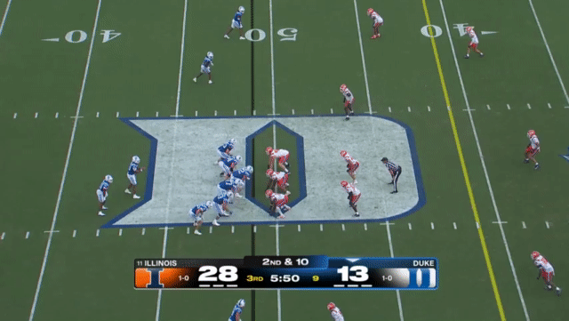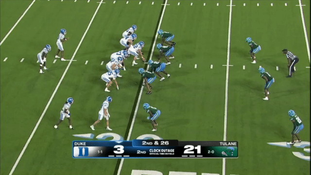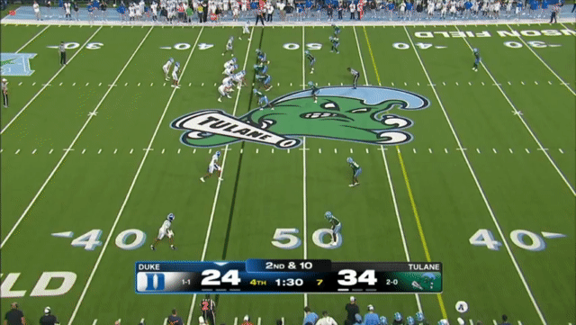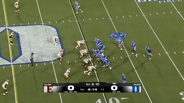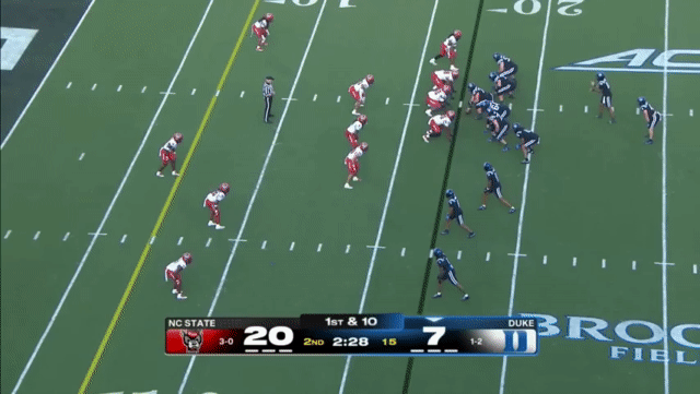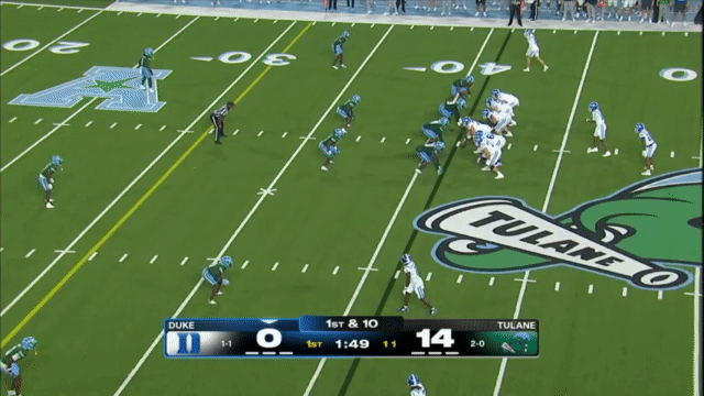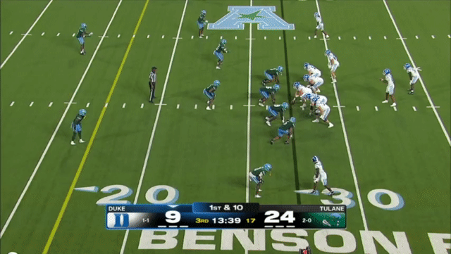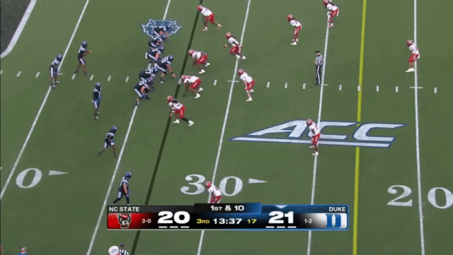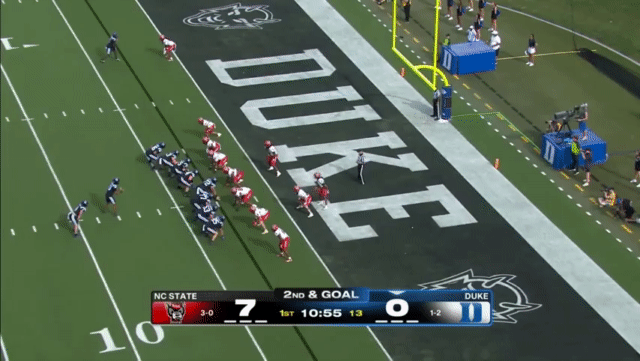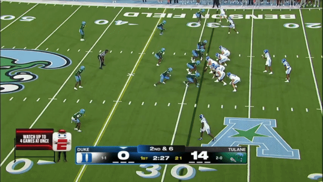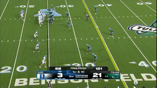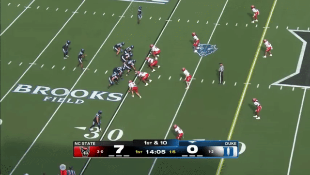 Duke likes to move the pocket with Mensah, who has a knack for throwing on the run, although he’s still prone to errant throws doing so. Here’s one of his best throws, which just so happened to come against his former team: