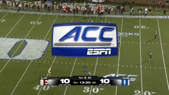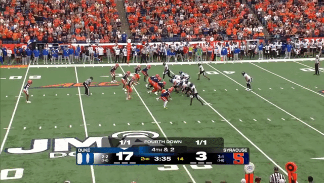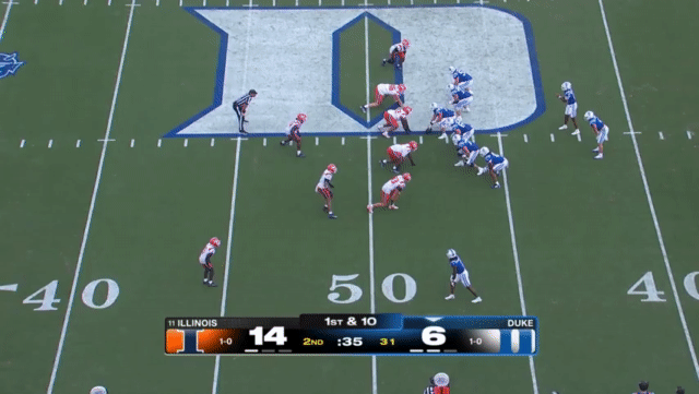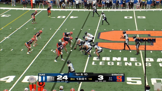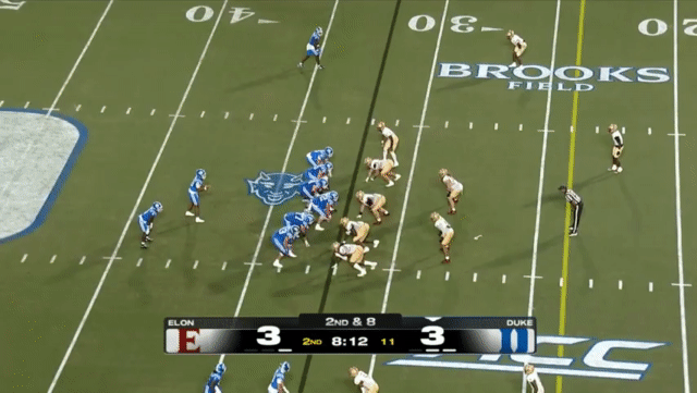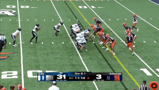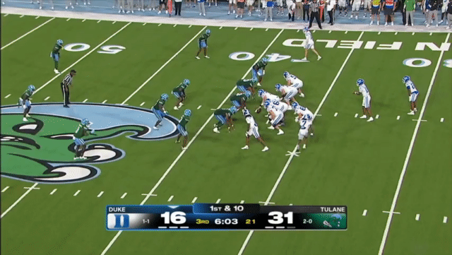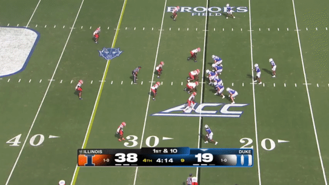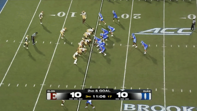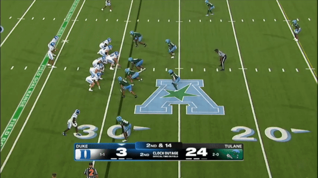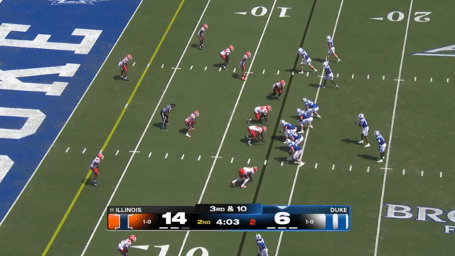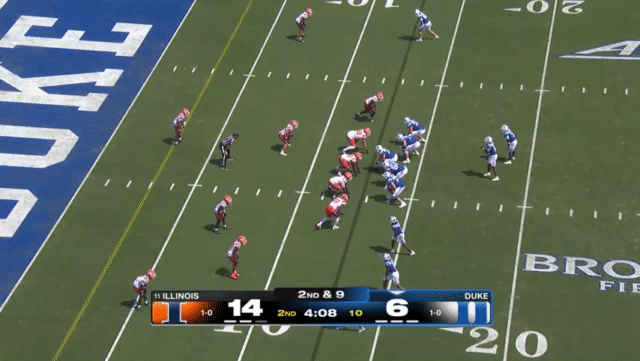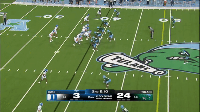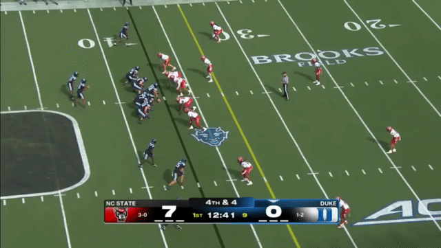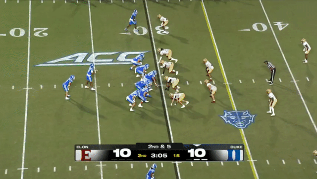 Duke likes to move the pocket with Mensah, who has a knack for throwing on the run, although he’s still prone to errant throws doing so. Here’s one of his best throws, which just so happened to come against his former team: