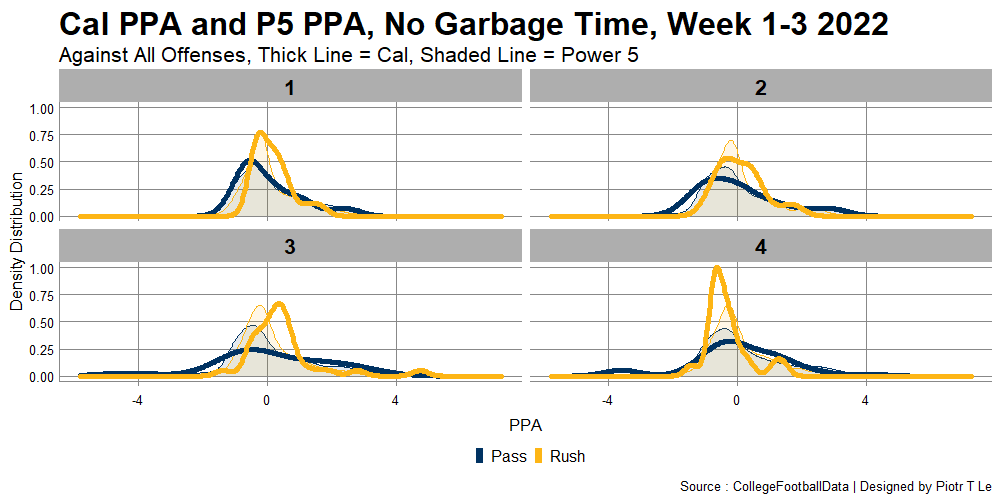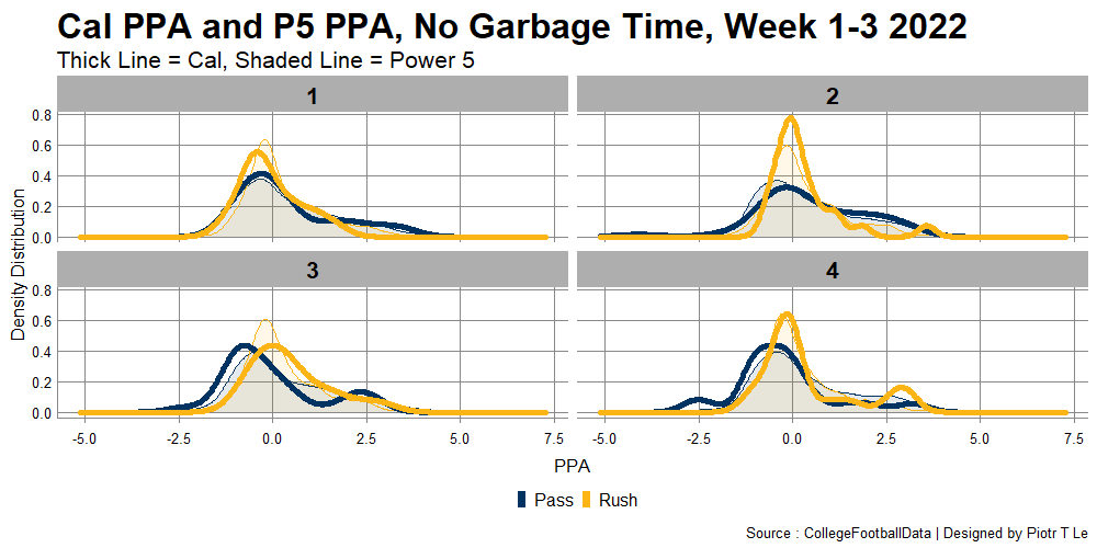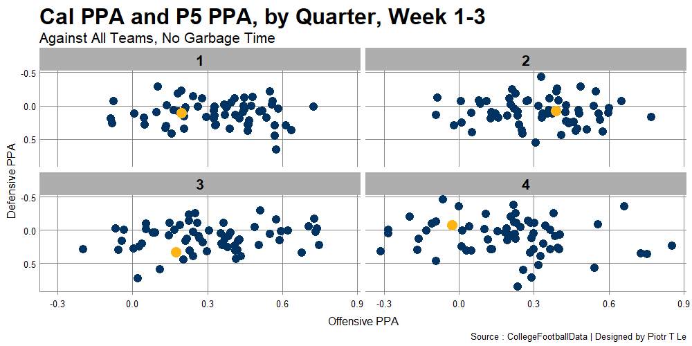 Looking at PPA distribution by quarter it remains that 3rd quarter is not ours. Something worth noting is that Cal offense livens up on Q2 only to really stall on Q3 and Q4. We’re just continuing to fail to do anything coming out of the half and now we’re tacking on negative PPA on offense. Basically, the offense is so bad in Q4 is that we’re actively detracting from the points added.