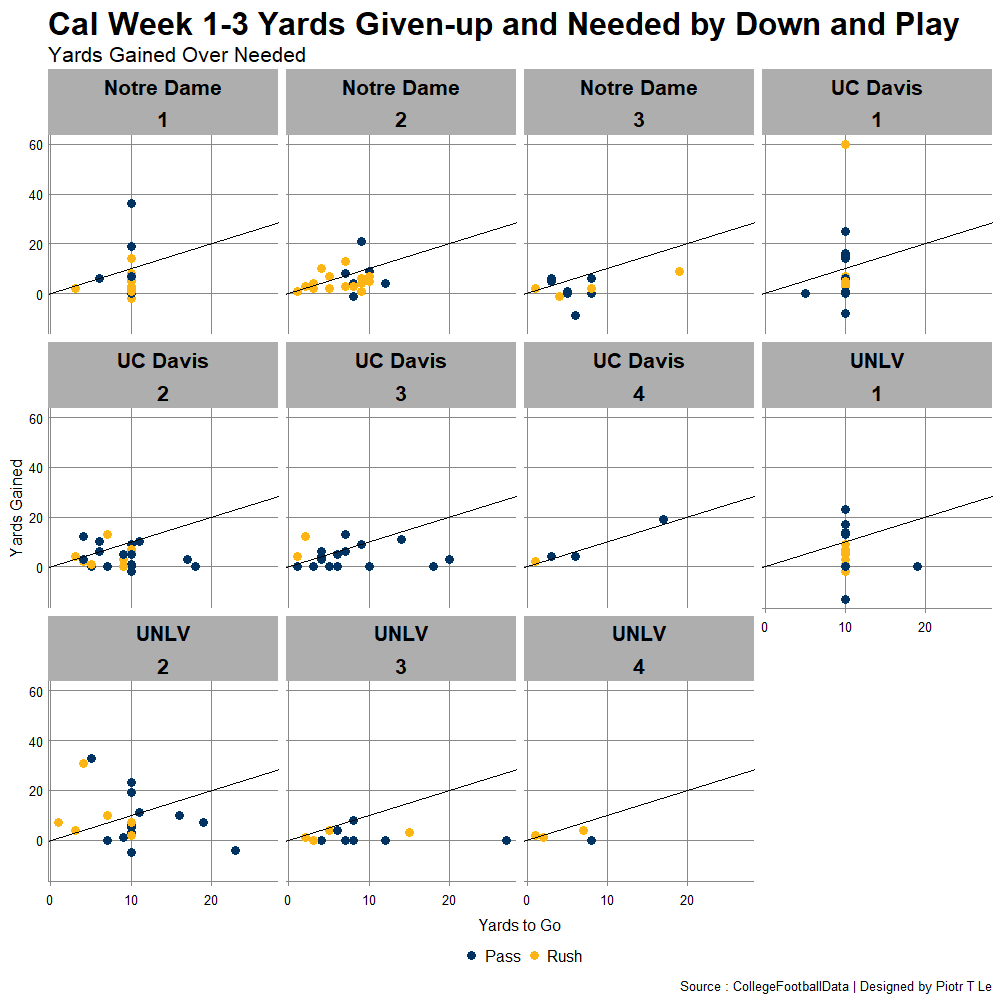 Cal defense struggled to do well on 3rd downs against the run. This makes sense since the DL still struggles to gain penetration on the point of attack giving up 2-3 yards on 3rd and short. Otherwise, again we’re pretty middle of the road with no big plays given up again, but we’re giving up the small gains especially on 2nd down in the run game.