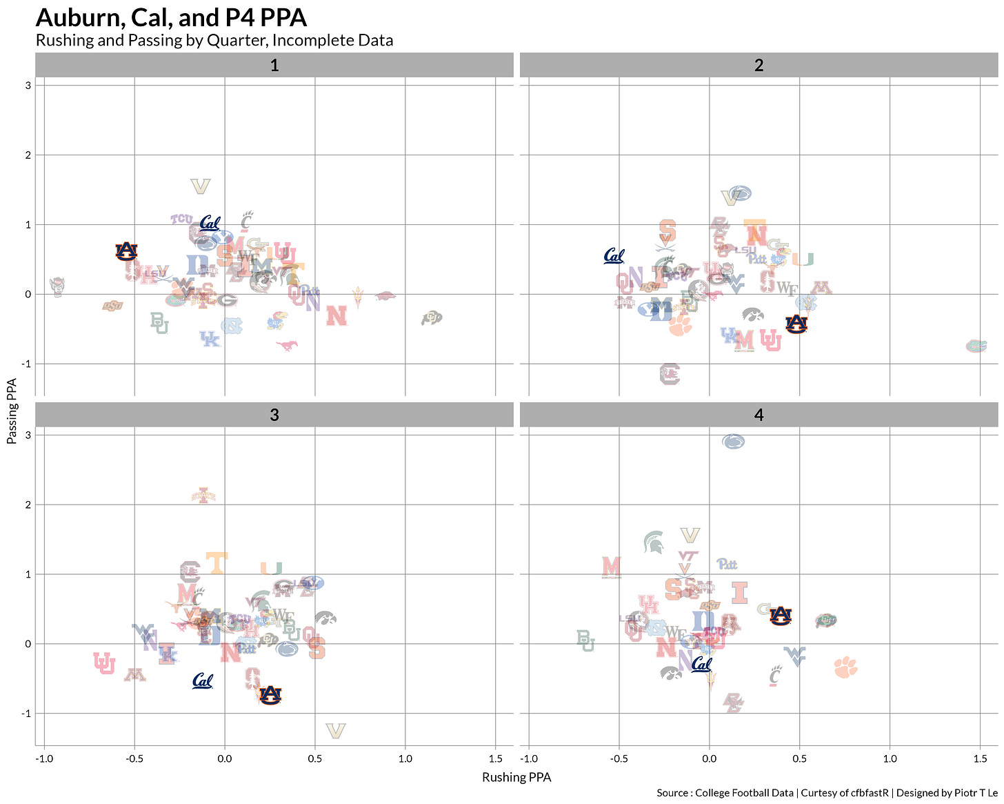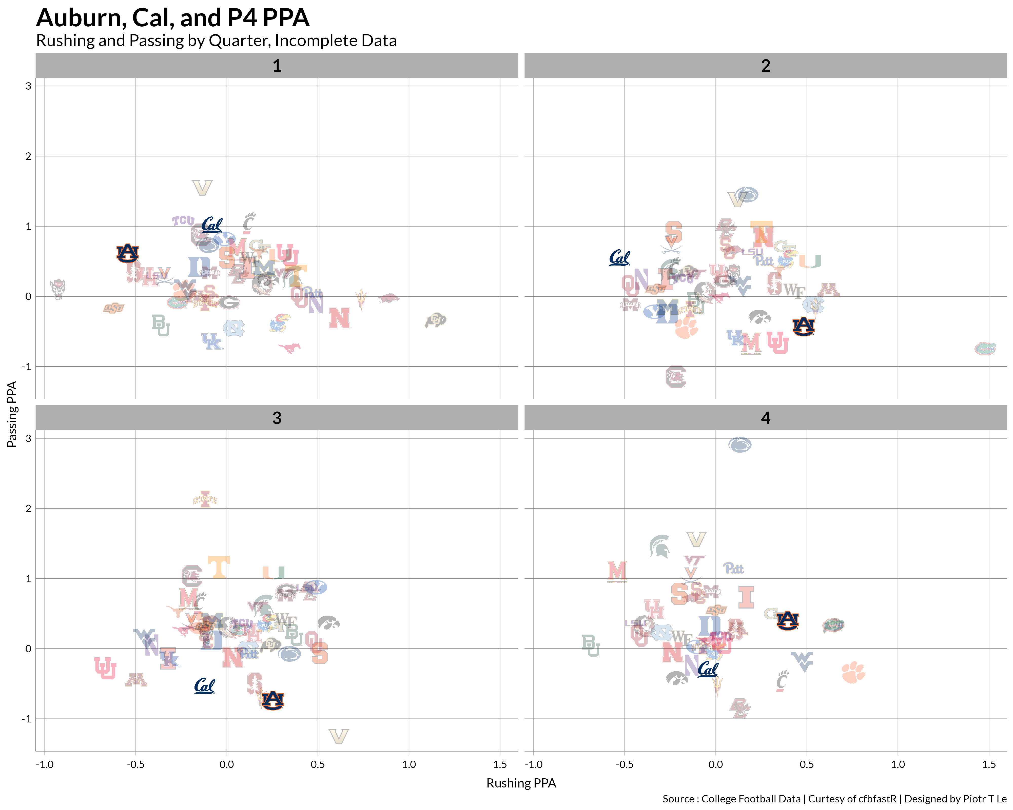 Early in the game the Cal and Auburn were able to be effective passing offenses but lacked in the rushing game, especially Auburn. However, the game pivoted in the 2nd quarter where the Cal offense was able to generate some movement through the air while the Auburn passing offense (that Hugh Freeze refused to abandon) began to crater, hitting a nadir in the 3rd where they were only surpassed by Vanderbuilt whose pool passing PPA was caused by the team being up by several scores against an FCS opponent and not really being locked in.