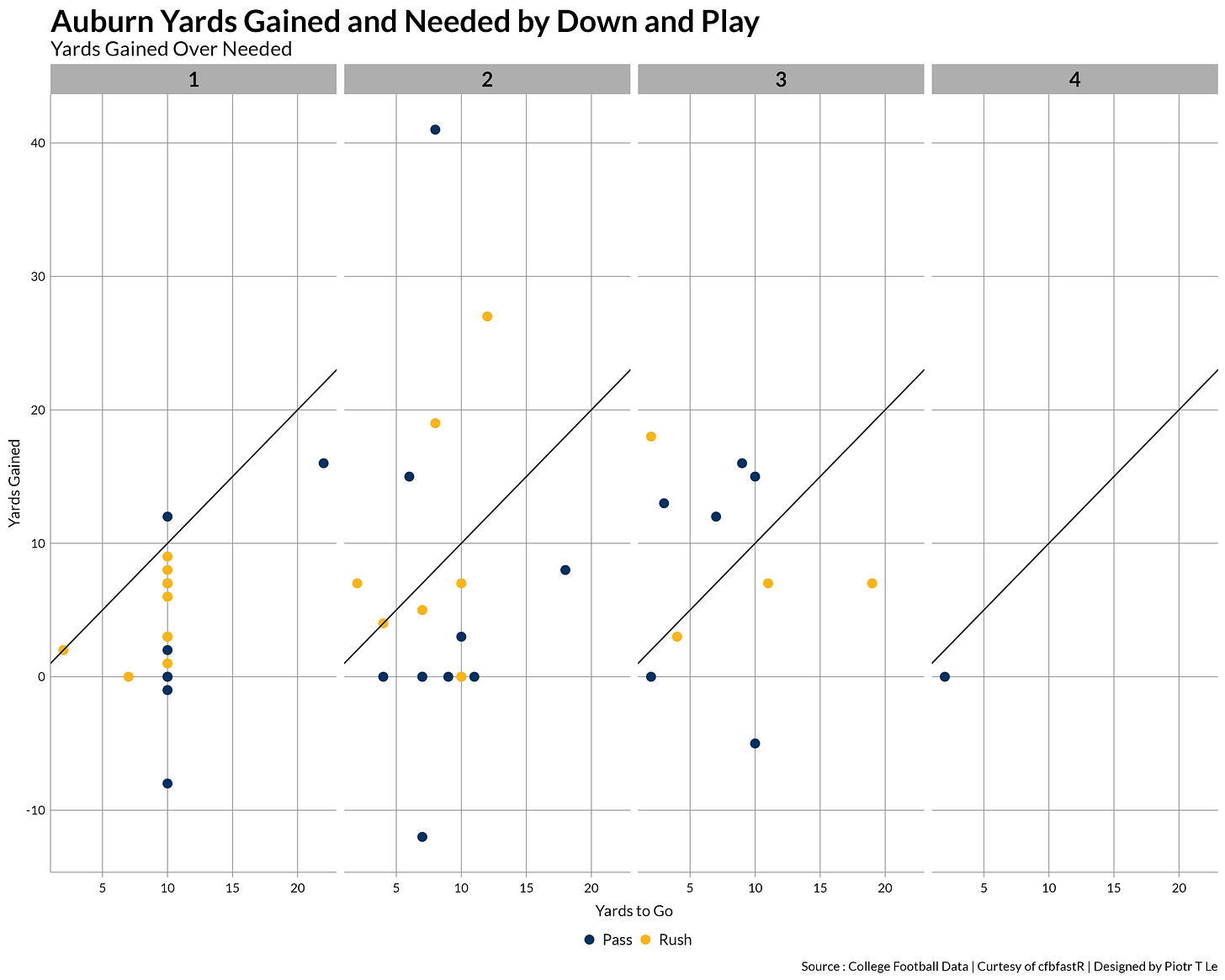 Here we see down by distance progression Auburn’s offense had to do vs. what they actually achieved. And on all accounts Cal forced Auburn in unfavordable downs in 2nd and 3rd downs, often putting their offense in passing down situations even early on and on 3rd down.