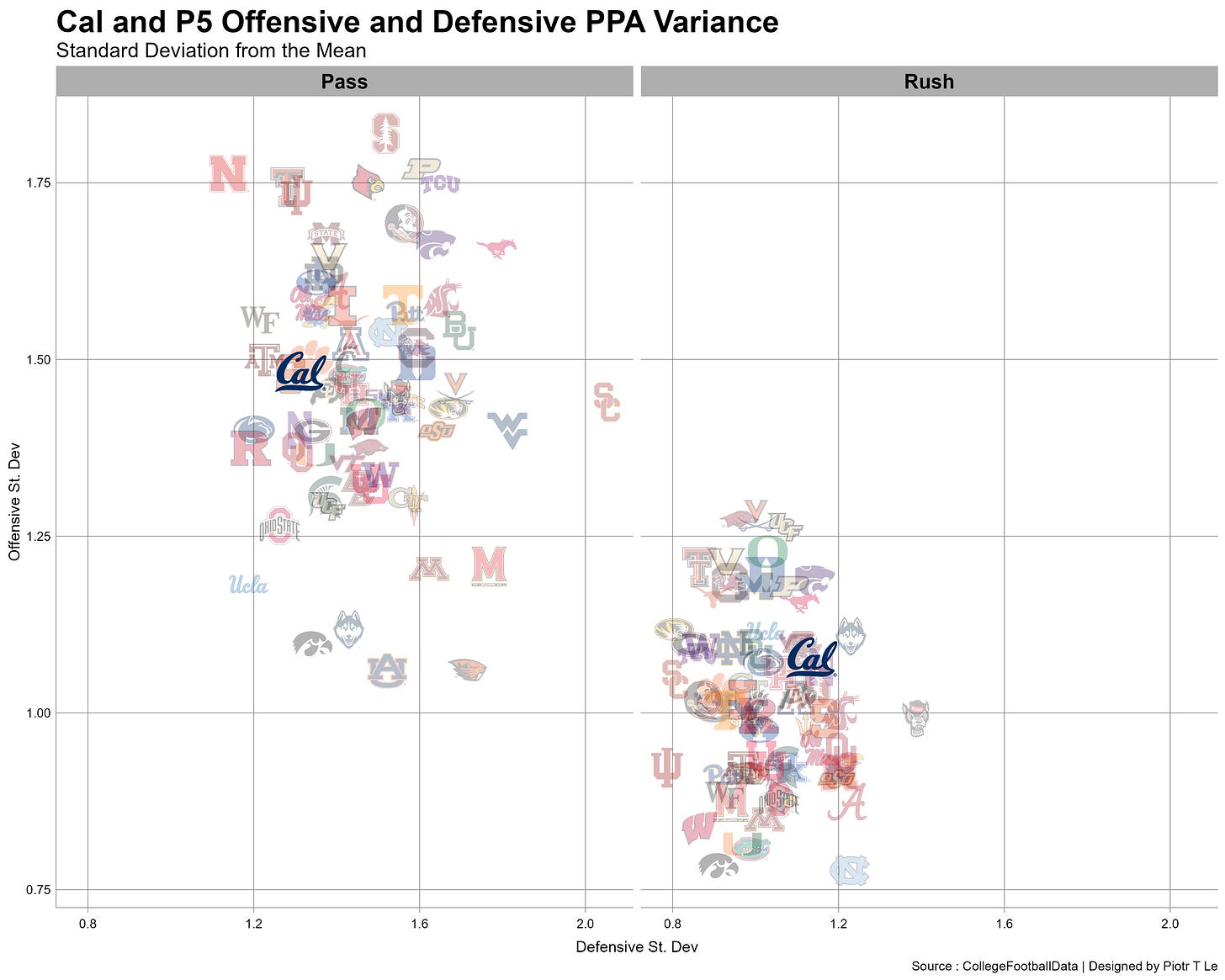 Looking at this in another way we should check out the good old fashioned standard deviation of PPA. The passing offense remains more or less as volatile as the national standard. I was honestly expecting more madness with the high highs of JKS’ passing with the low lows of his interceptions or miscues on key downs.