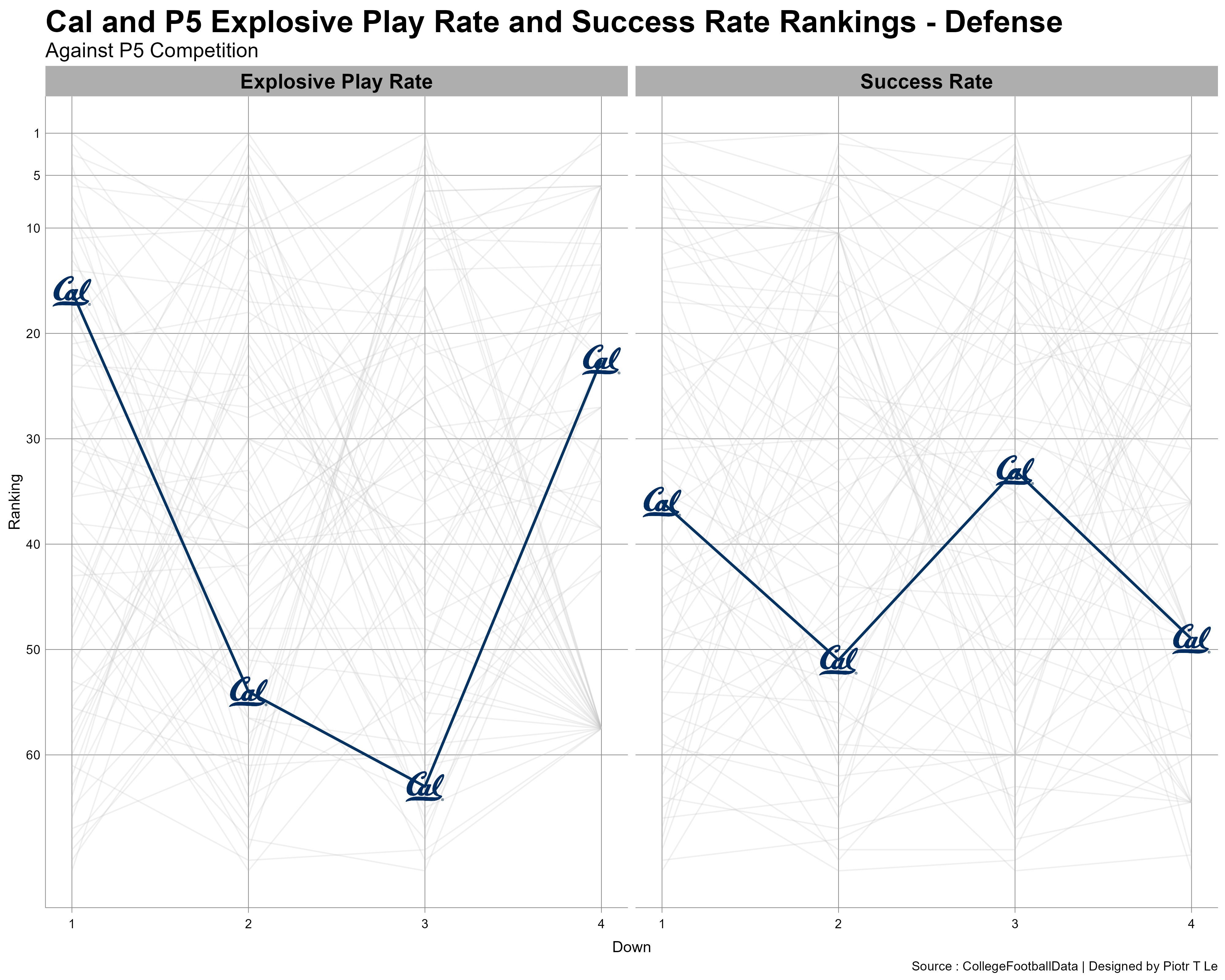 Going back to explosive play and success rates, this time on defense, we can see the same trend we have seen in the past: the defense holds well in early downs only to give up massive gains on 2nd or 3rd downs. Now on average the defense does an average job on 3rd down, but when they do allow a conversion on those downs it just feels crushing since it is usually an explosive play.