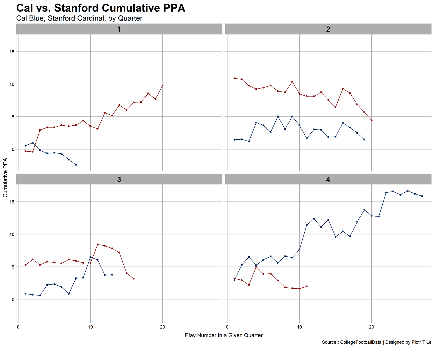 Here we can see the palpable change in the momentum of the game. Stanford jumped quickly and early to gain a massive PPA lead only to slowly lose it all through the Q2 and Q3. Cal started the game very poorly only to slowly recover in Q3 and really explove in the 4th quarter.