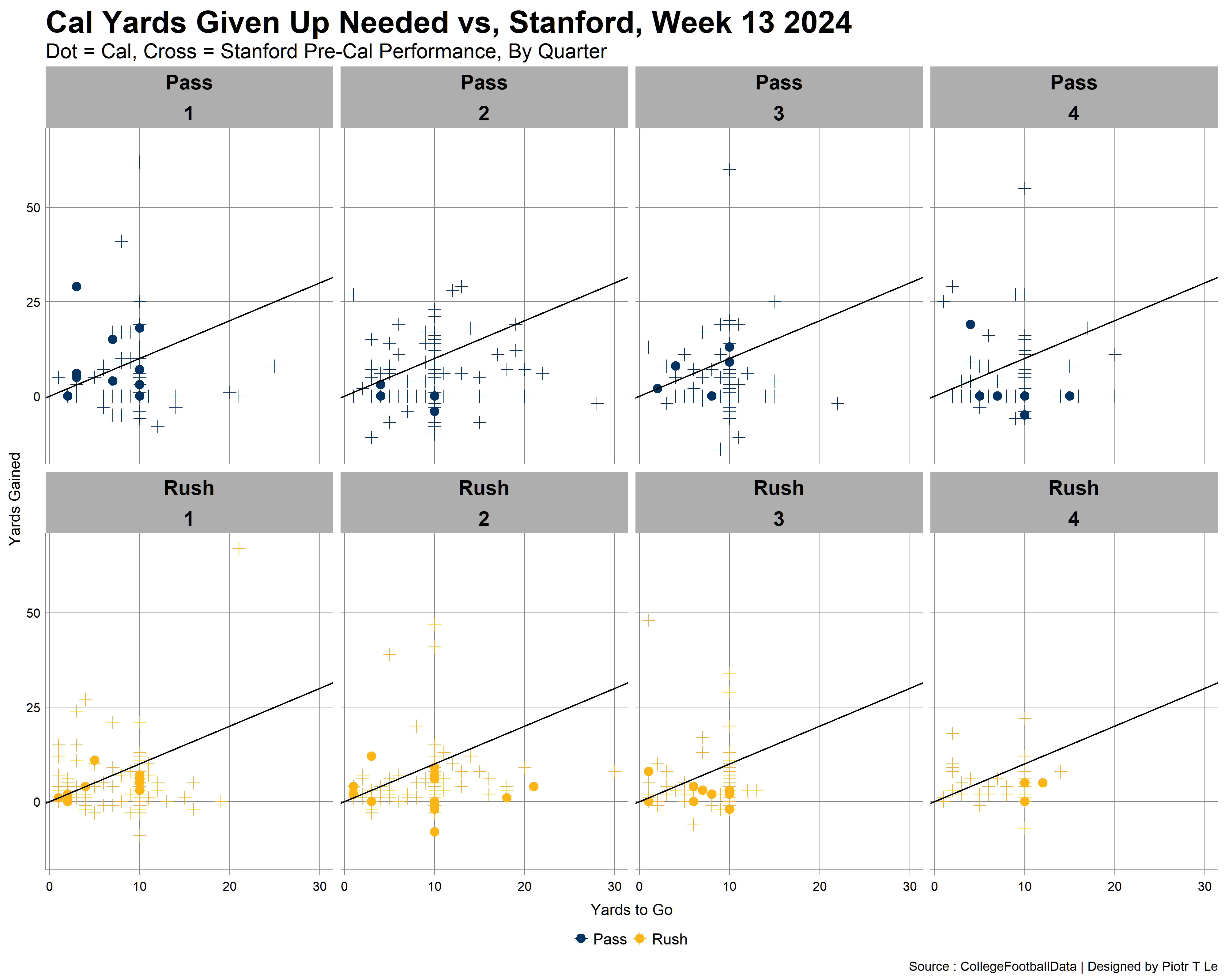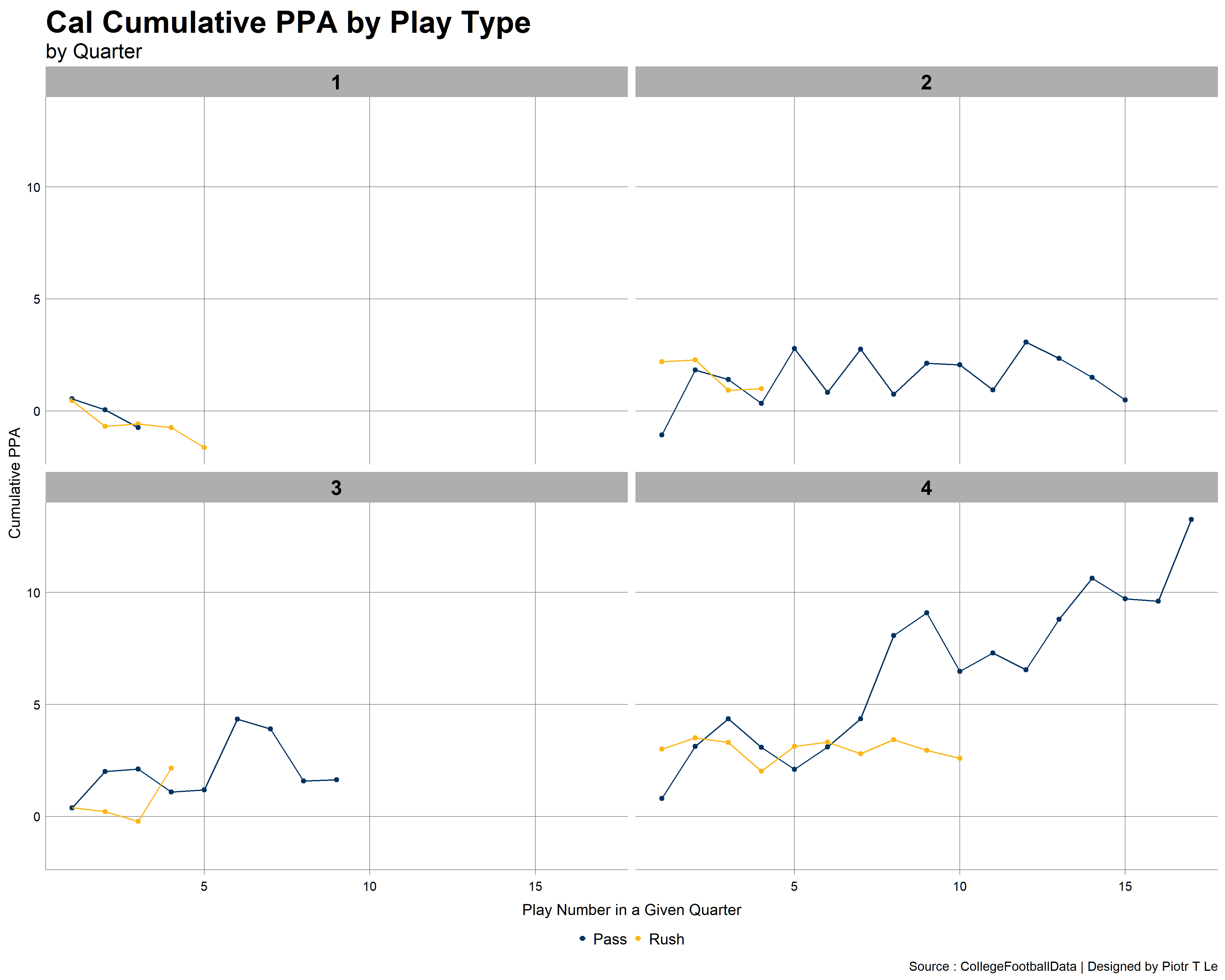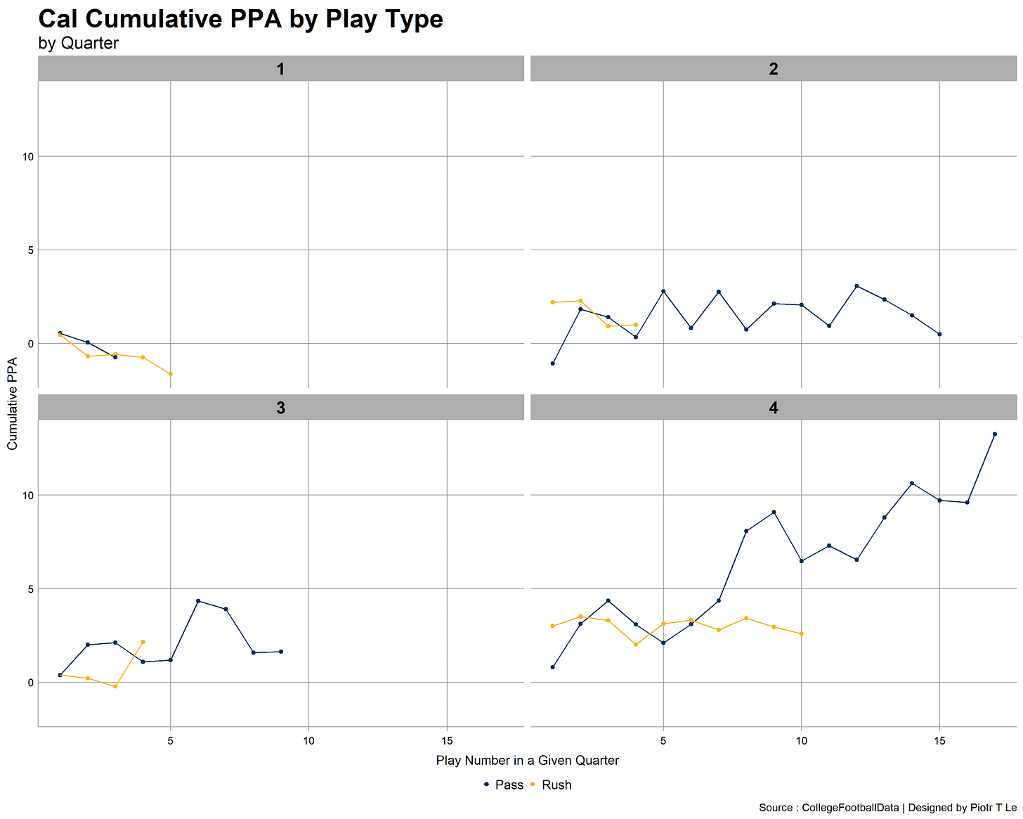 We can see here that Cal offense realized that there was no point to running the ball after the 1st quarter. Add in that the rushing game had a handful of moments of mediocrity at the end it was Fernando’s arm that delivered the resurgence in Q3 to Q4. One has to admire the explosive boom in PPA in Q4. A mathematical expression of “98 yards with the boys”.