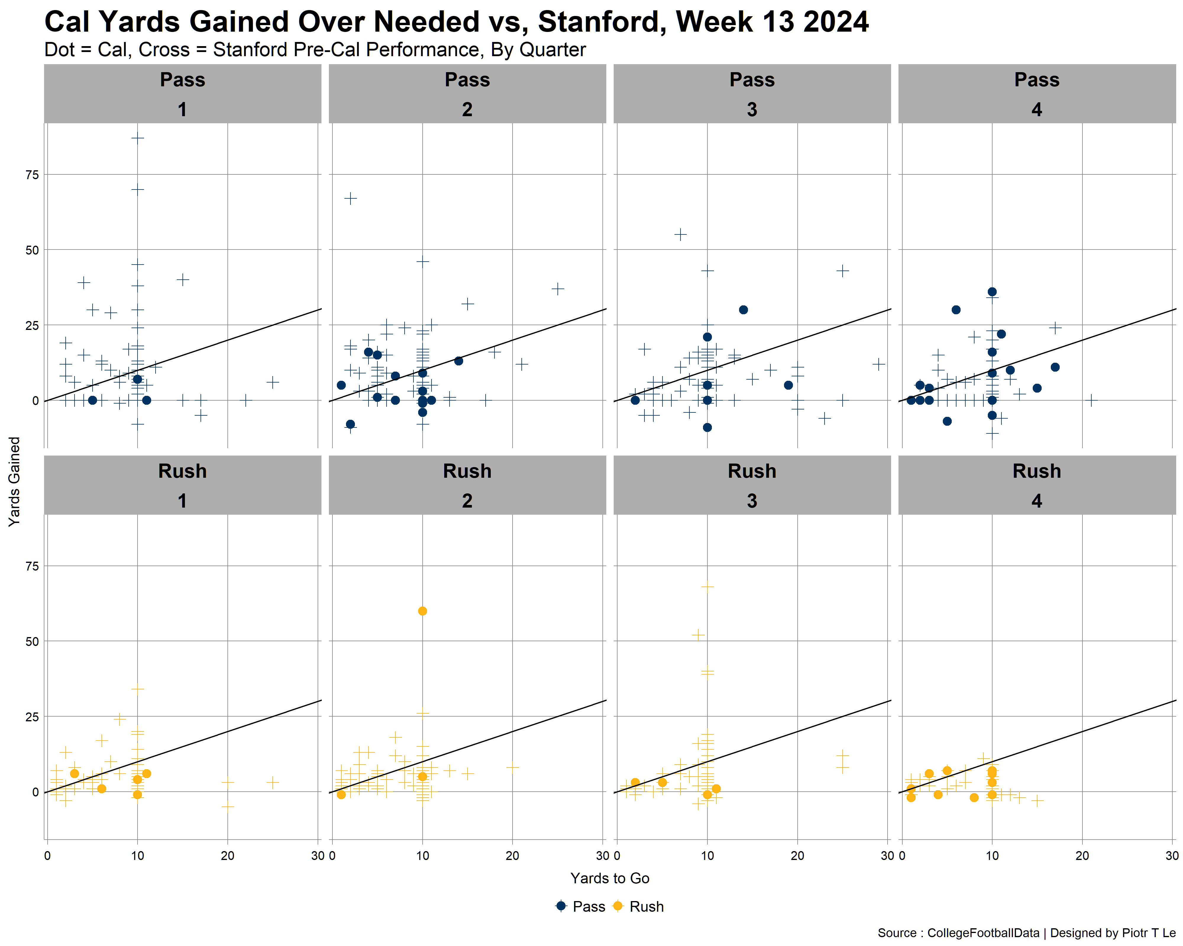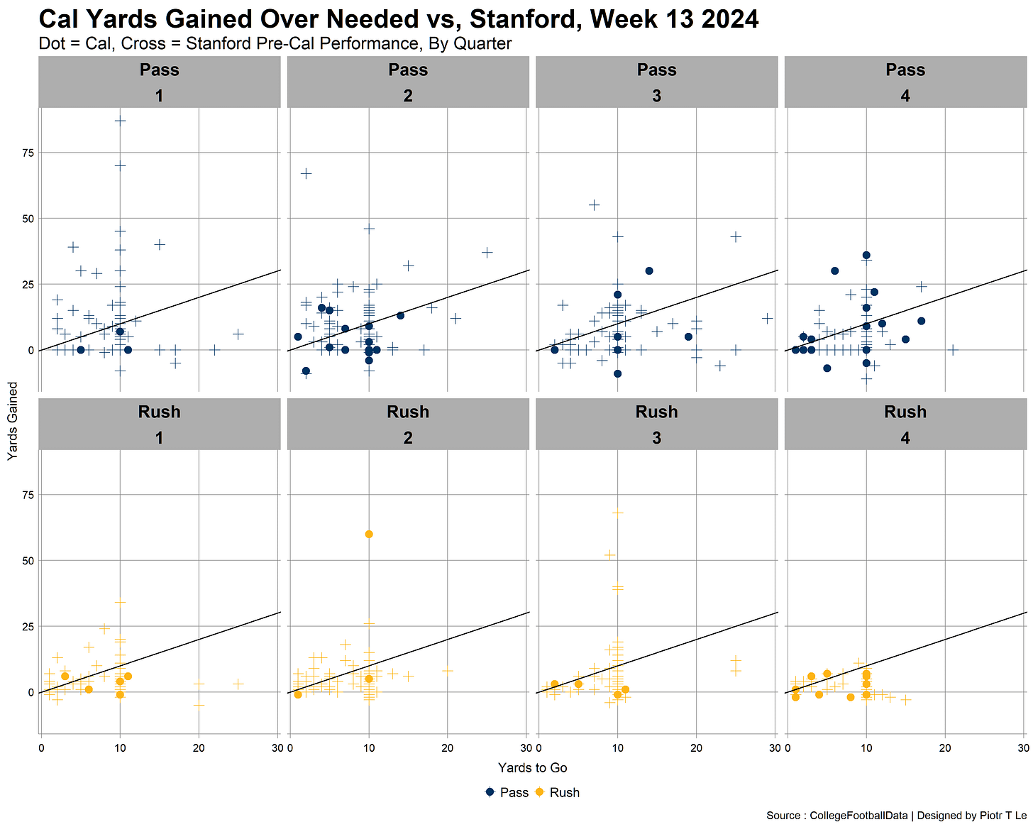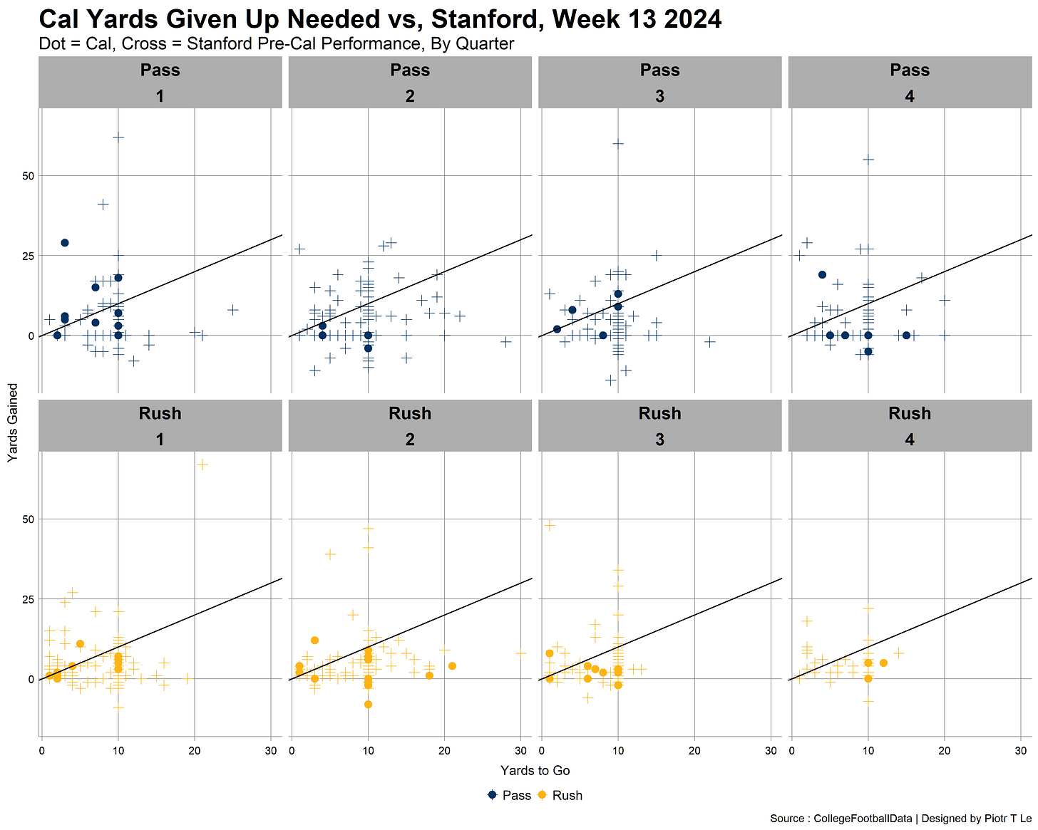 We can see here that Cal offense realized that there was no point to running the ball after the 1st quarter. Add in that the rushing game had a handful of moments of mediocrity at the end it was Fernando’s arm that delivered the resurgence in Q3 to Q4. One has to admire the explosive boom in PPA in Q4. A mathematical expression of “98 yards with the boys”.