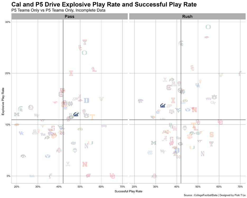 Cal offense is fun because of the passing game that keeps the team on schedule, and both are above average in explosive play rate.