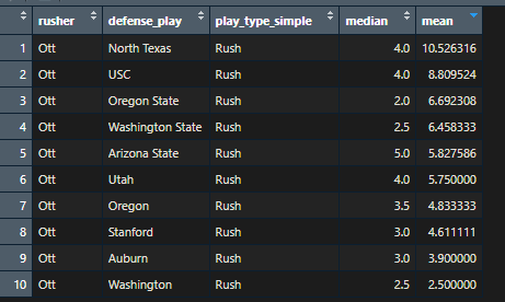 The passing percentages are skewed by the low volume of catches. Note the lack of explosives past the 20 yard line and the 20 yard bump is the last run of the game. But Jaydn overall kept running and kept grinding out runs.