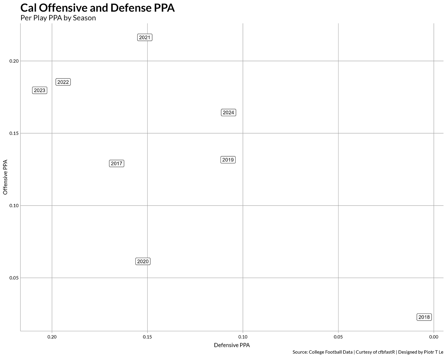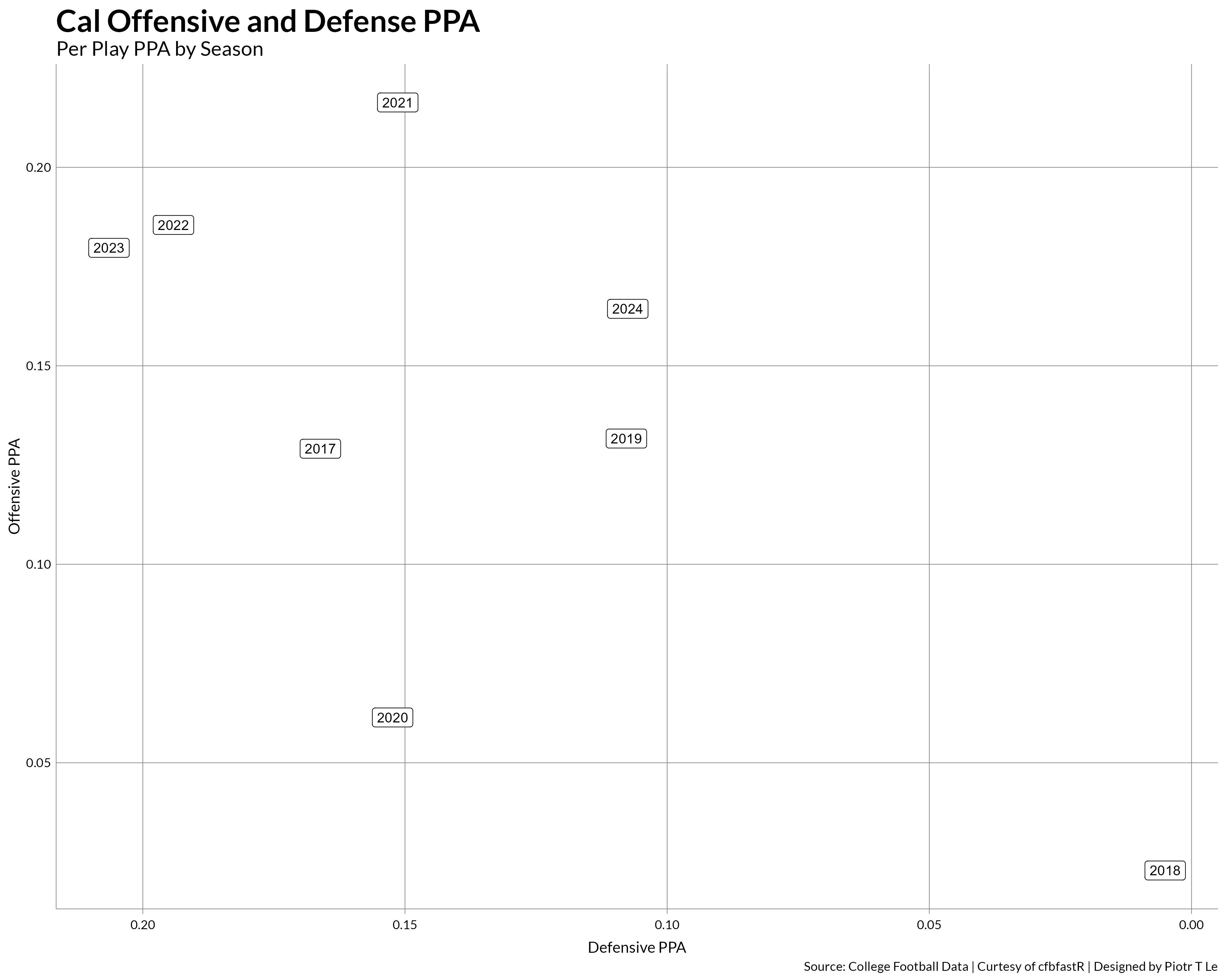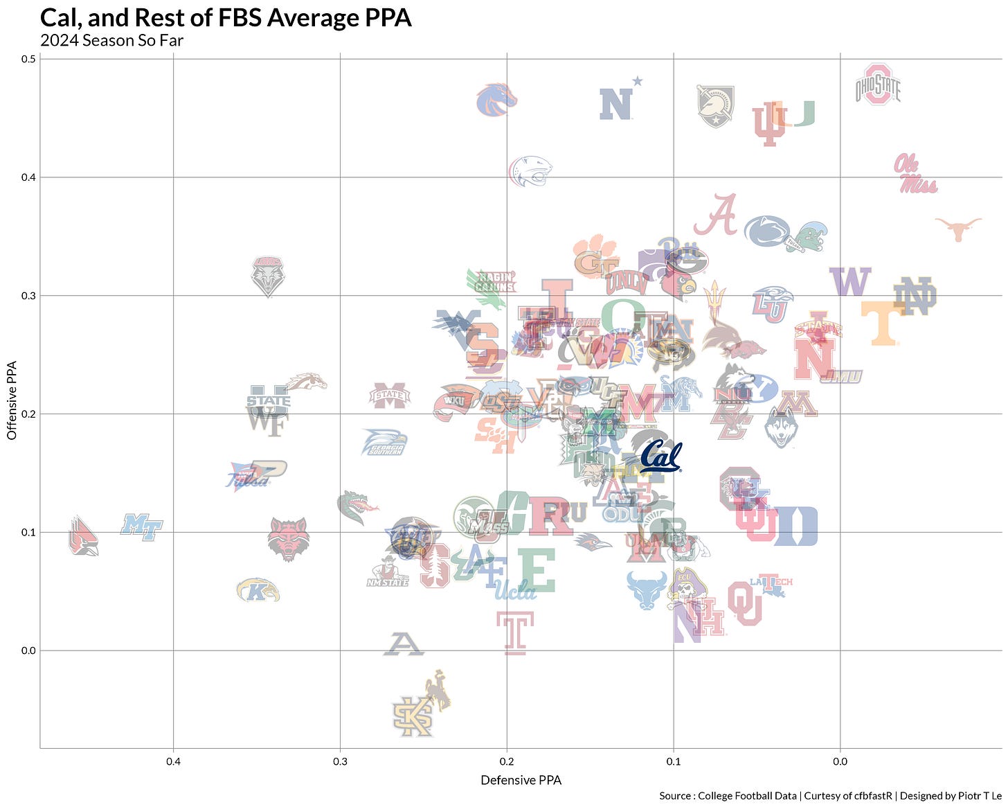 On a positive note: Wake and Stanford are on the bad side of both of the statistics, Syraruse boasts an offense of the same tier as Auburn, NC state has a slightly better offense but a worse defense but a bigger margin, Pitt was one of the best offenses we were able to subdue into pedestrian levels, and SMU is not distinct enough to be an outlier from the cluster of mediocrity Cal is on the edge of. The schedule will get easier.